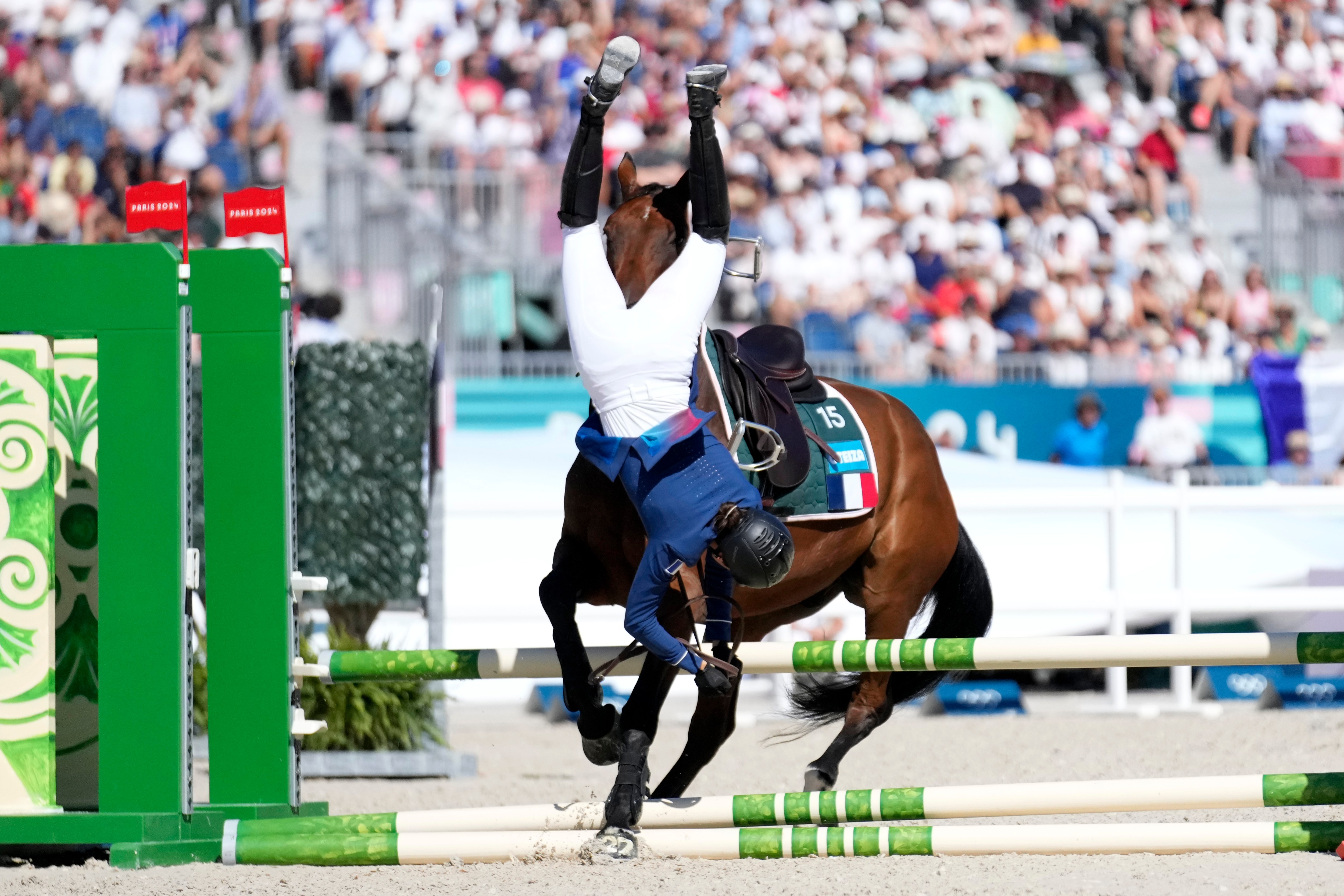 France's Marie Oteiza falls while riding Babouchka de la Bride IFCE during the final riding show of the women's individual in the modern pentathlon at the 2024 Summer Olympics, Sunday, August 11, 2024, in Versailles, France. (Photo by Mosa'ab Elshamy/AP Photo)