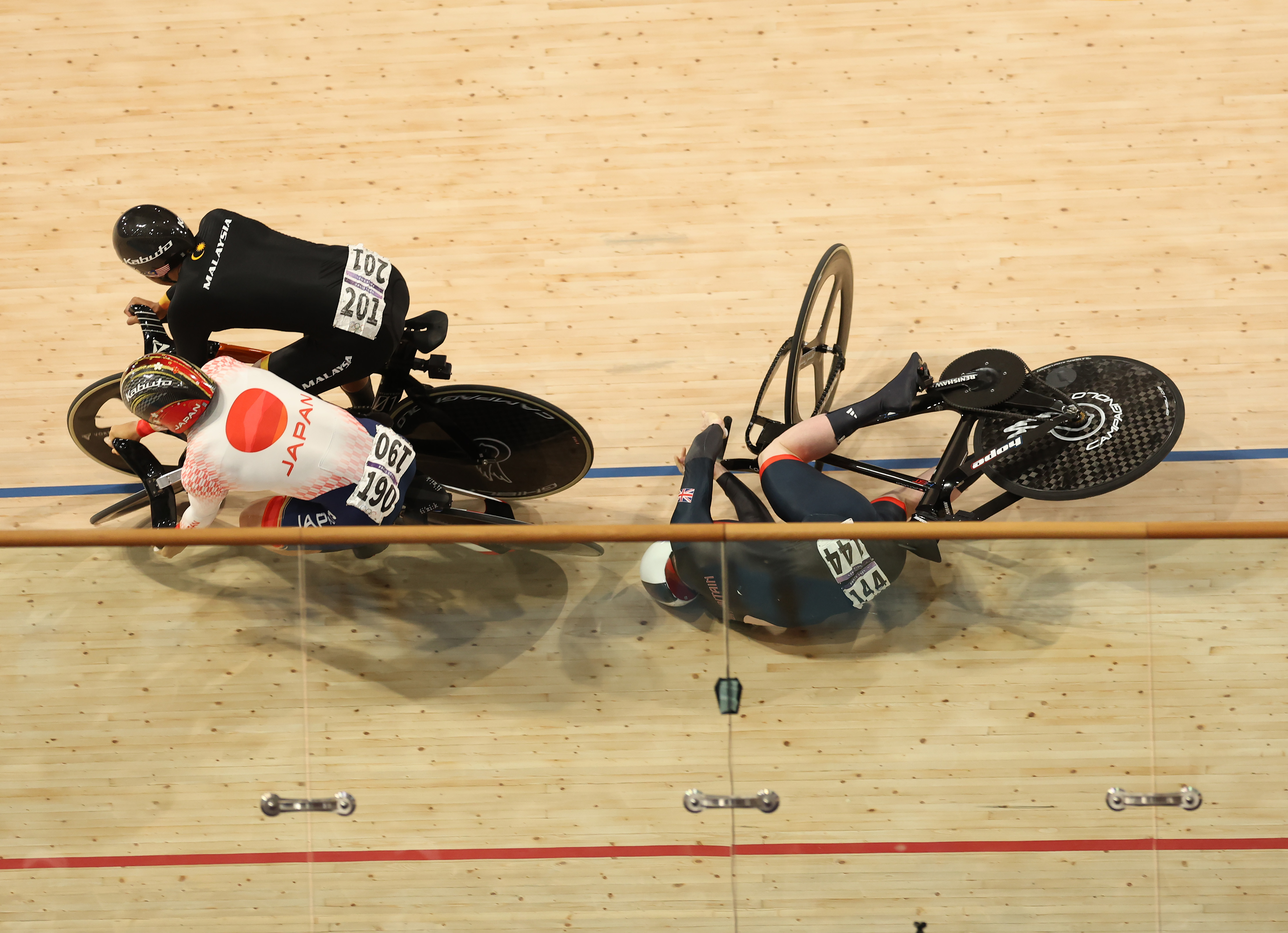 Jack Carlin of Team Great Britain crashes in the Keirin final on day sixteen of the Olympic Games Paris 2024 at Saint-Quentin-en-Yvelines Velodrome on August 11, 2024 in Paris, France. (Photo by Ian MacNicol/Getty Images)