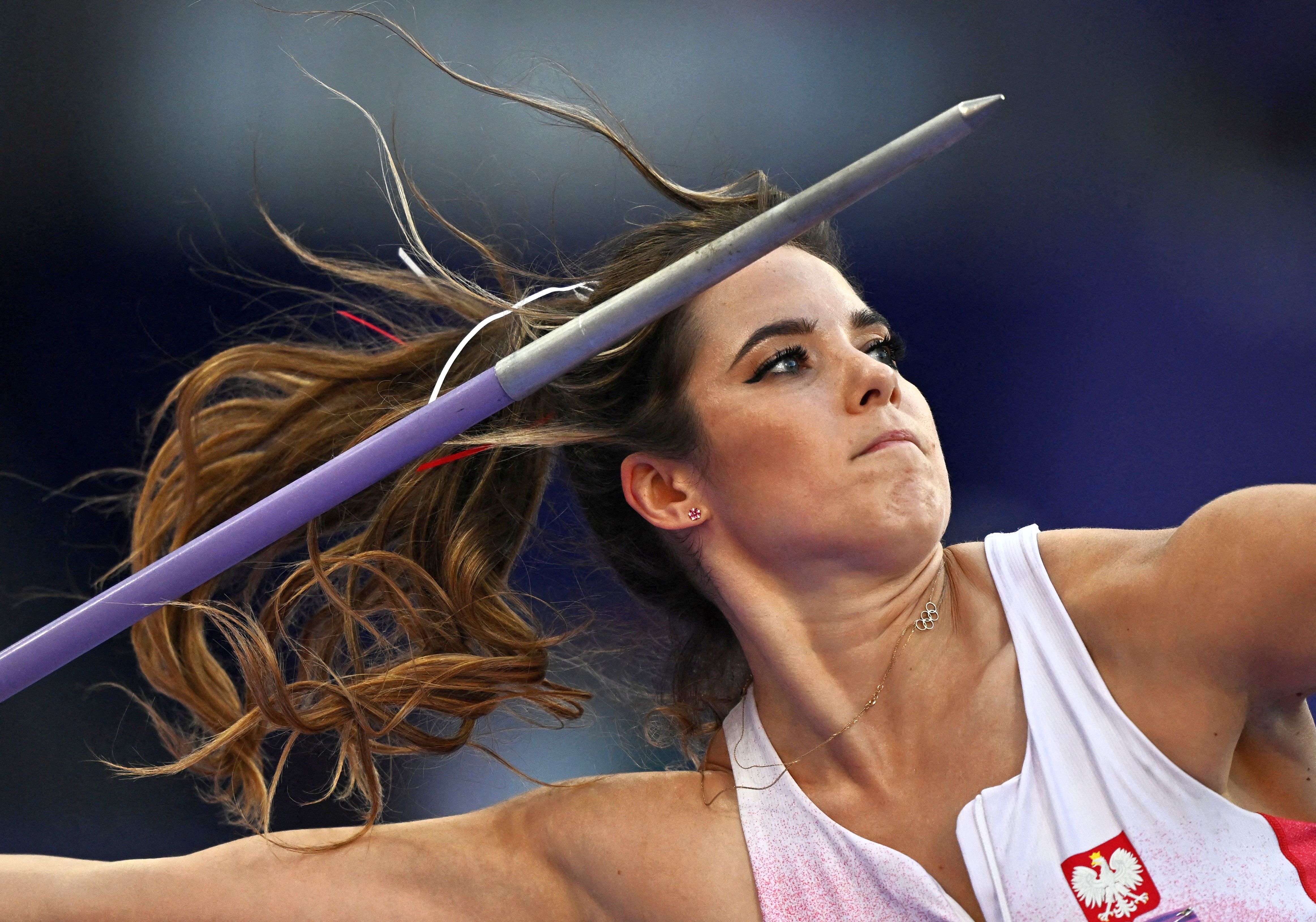 Poland's Maria Andrejczyk competes in the women's javelin throw final of the athletics event at the Paris 2024 Olympic Games at Stade de France in Saint-Denis, north of Paris, on August 10, 2024. (Photo by Dylan Martinez/Reuters)