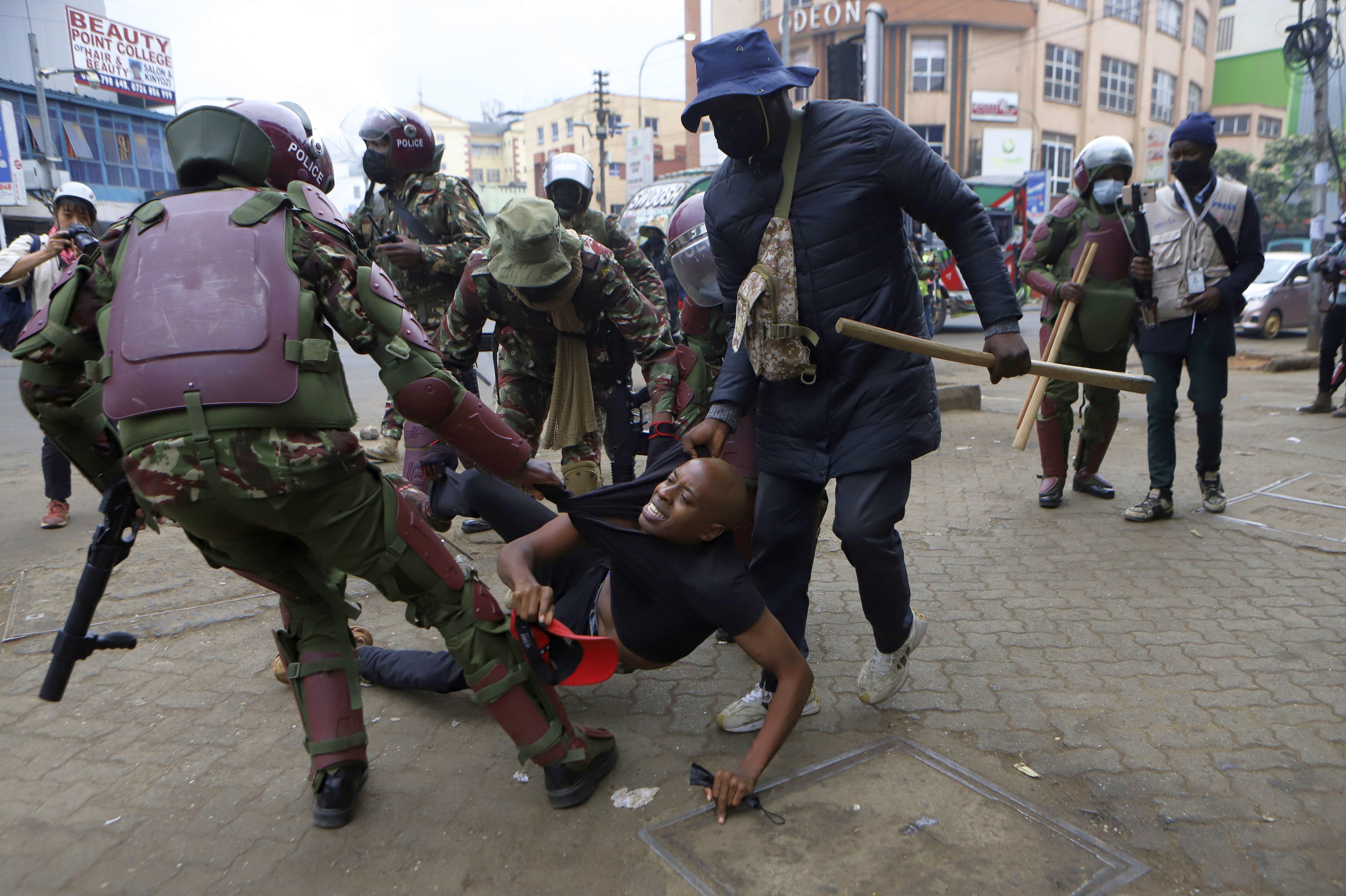 A protester is arrested in Nairobi, Kenya, Thursday August 8, 2024, during a demonstration against hunger. (Photo by Andrew Kasuku/AP Photo)