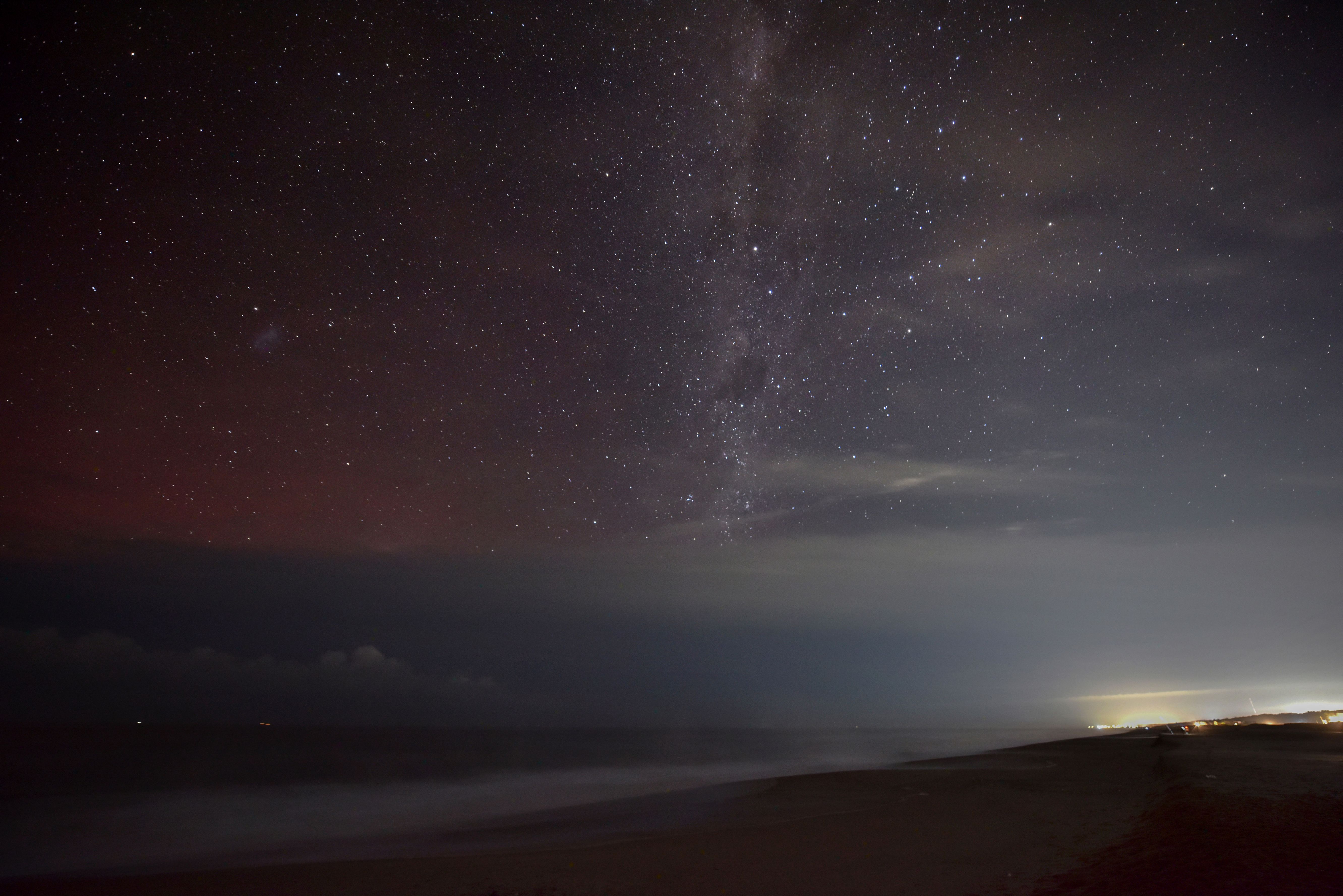 The Aurora Australis, also known as the Southern Lights, is faintly seen over the Atlantic Ocean to the left of the Milky Way from Santa Monica beach near Jose Ignacio, Maldonado Department, Uruguay, on May 11, 2024, with the lights of Punta del Este glowing on the right. The most powerful solar storm in more than two decades struck Earth, triggering spectacular celestial light shows from Tasmania to Britain – and threatening possible disruptions to satellites and power grids as it persists into the weekend. (Photo by Mariana Suarez/AFP Photo)