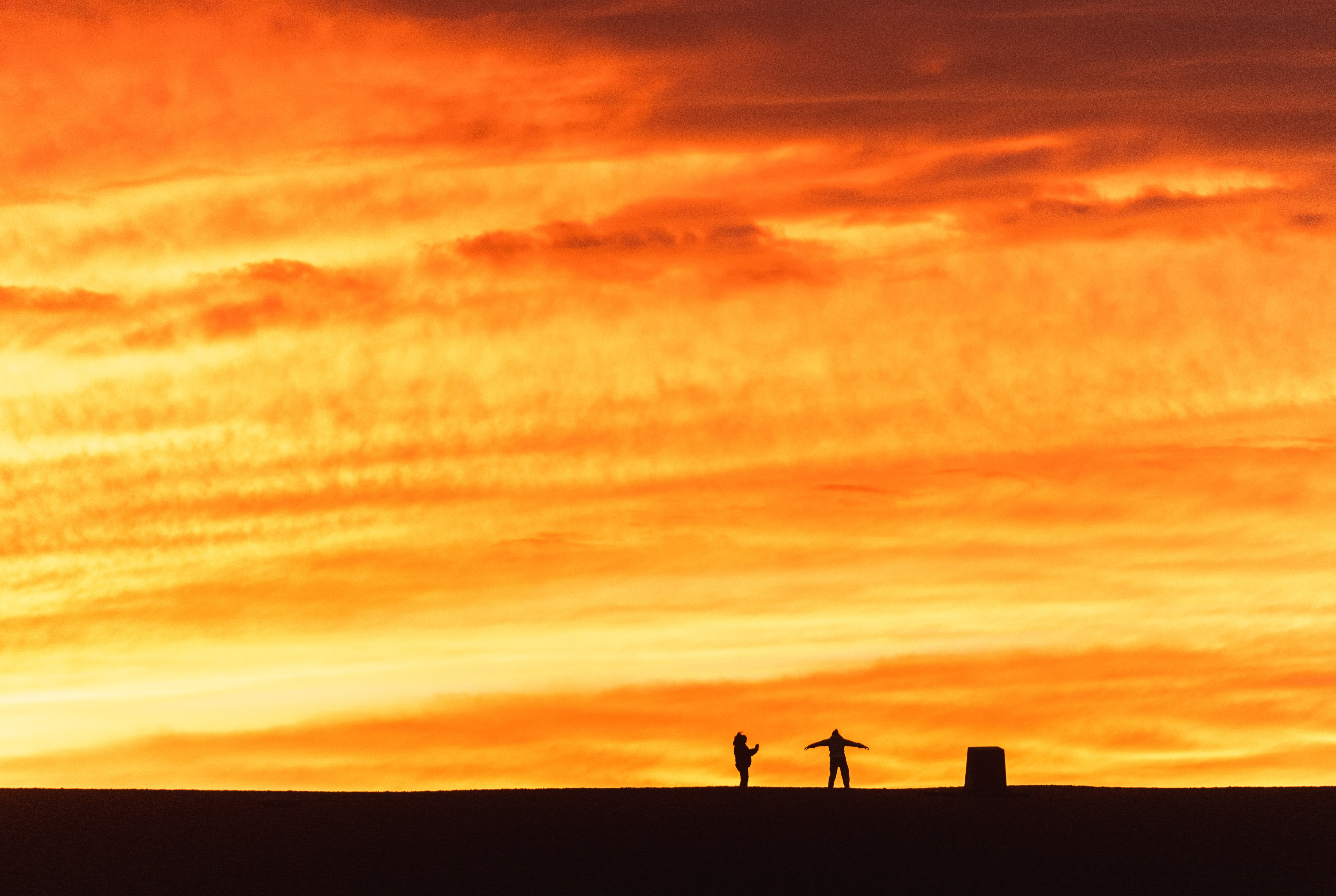 A couple are silhouetted against a spectacular sunset over the Isle of Portland in Dorset, UK on December 27, 2023. (Photo by West Bay Photography/BNPS)