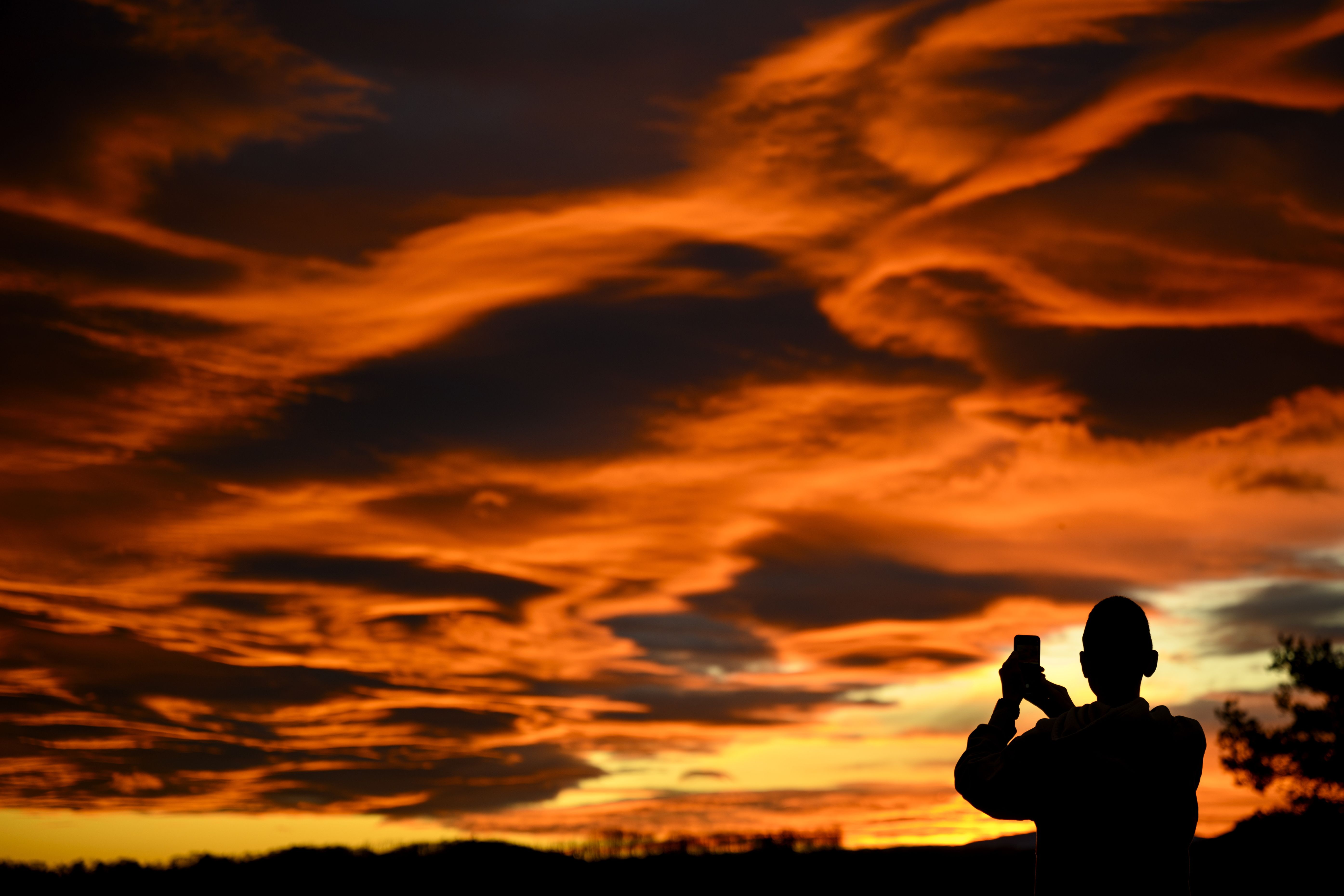 A person takes pictures with a smartphone of the sky illuminated during sunset behind the Jura mountains in Gros-de-Vaud Region on Christmas eve, in Daillens, southwestern Switzerland on December 24, 2023. (Photo by Laurent Gilliéron/EPA/EFE)