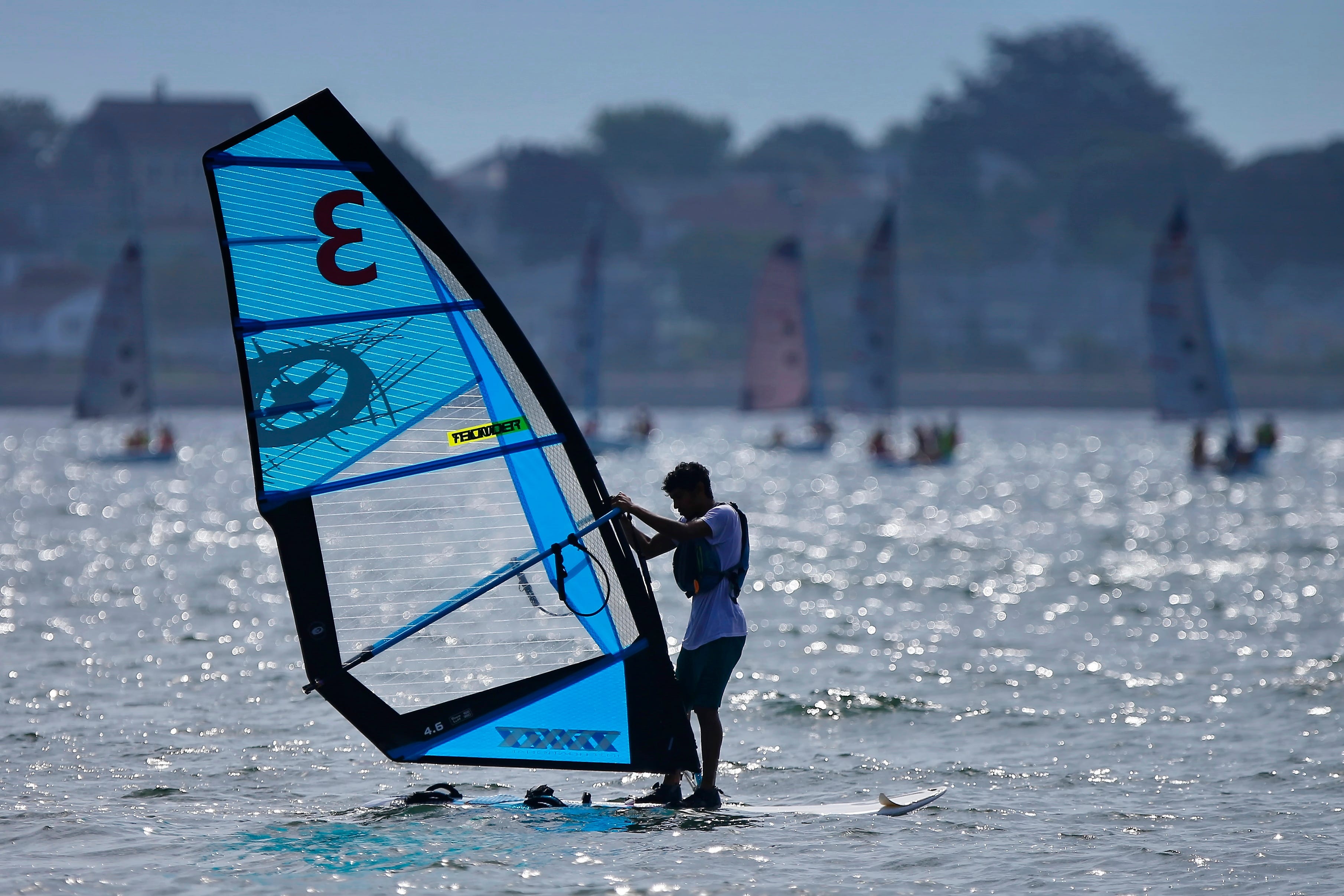 A Community Boating student works on his windsurfing skills on Clarks Cove in New Bedford, Mass. on August 9, 2024. (Photo by Peter Pereira/The Standard-Times via USA TODAY Network)