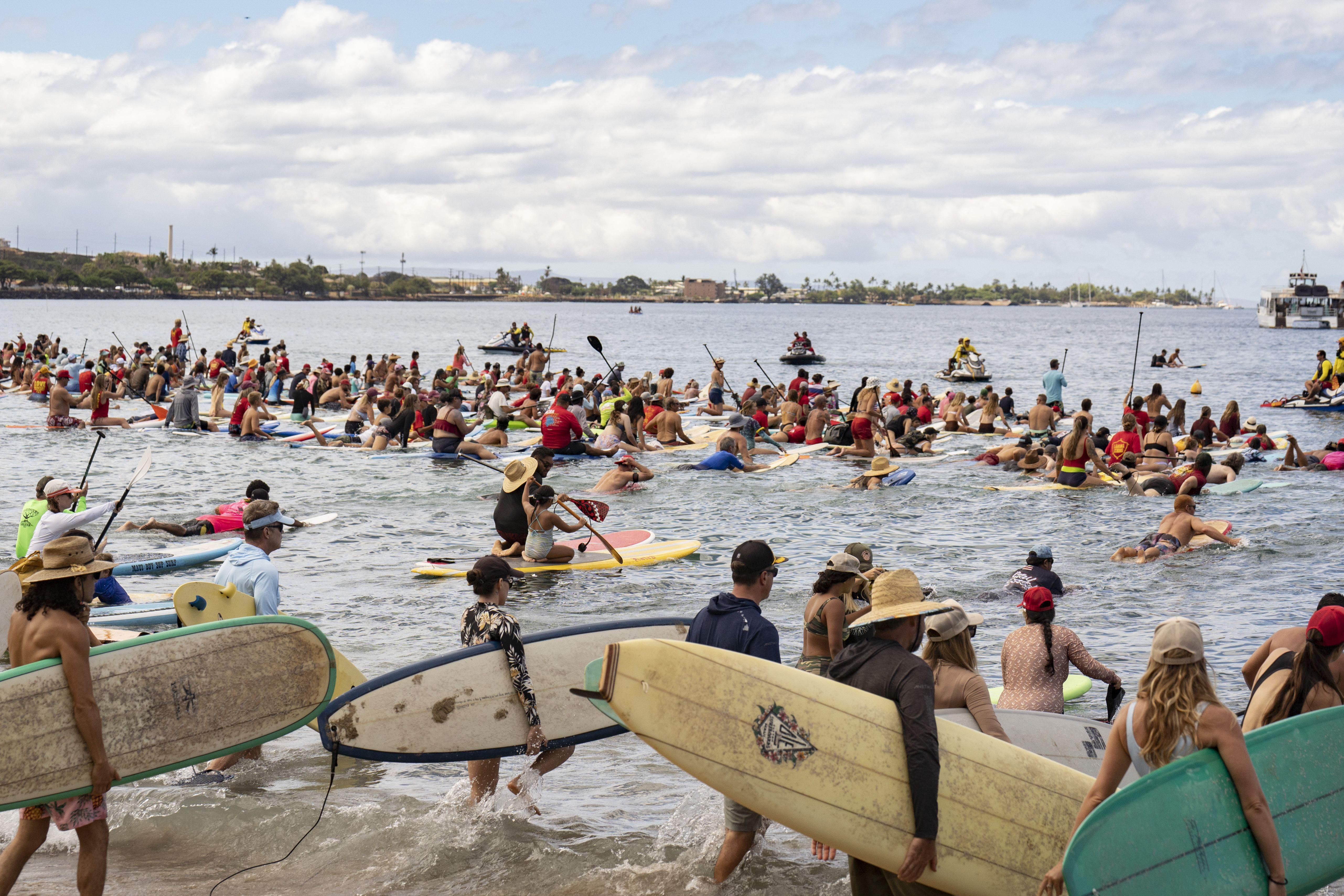 Hundreds of surfers paddle out into the waters of Hanakaoʻo Park as part of the ceremony marking the one-year anniversary of the Lahaina wildfire on Thursday, August 8, 2024, in Lahaina, Hawaii. (Photo by Mengshin Lin/AP Photo)