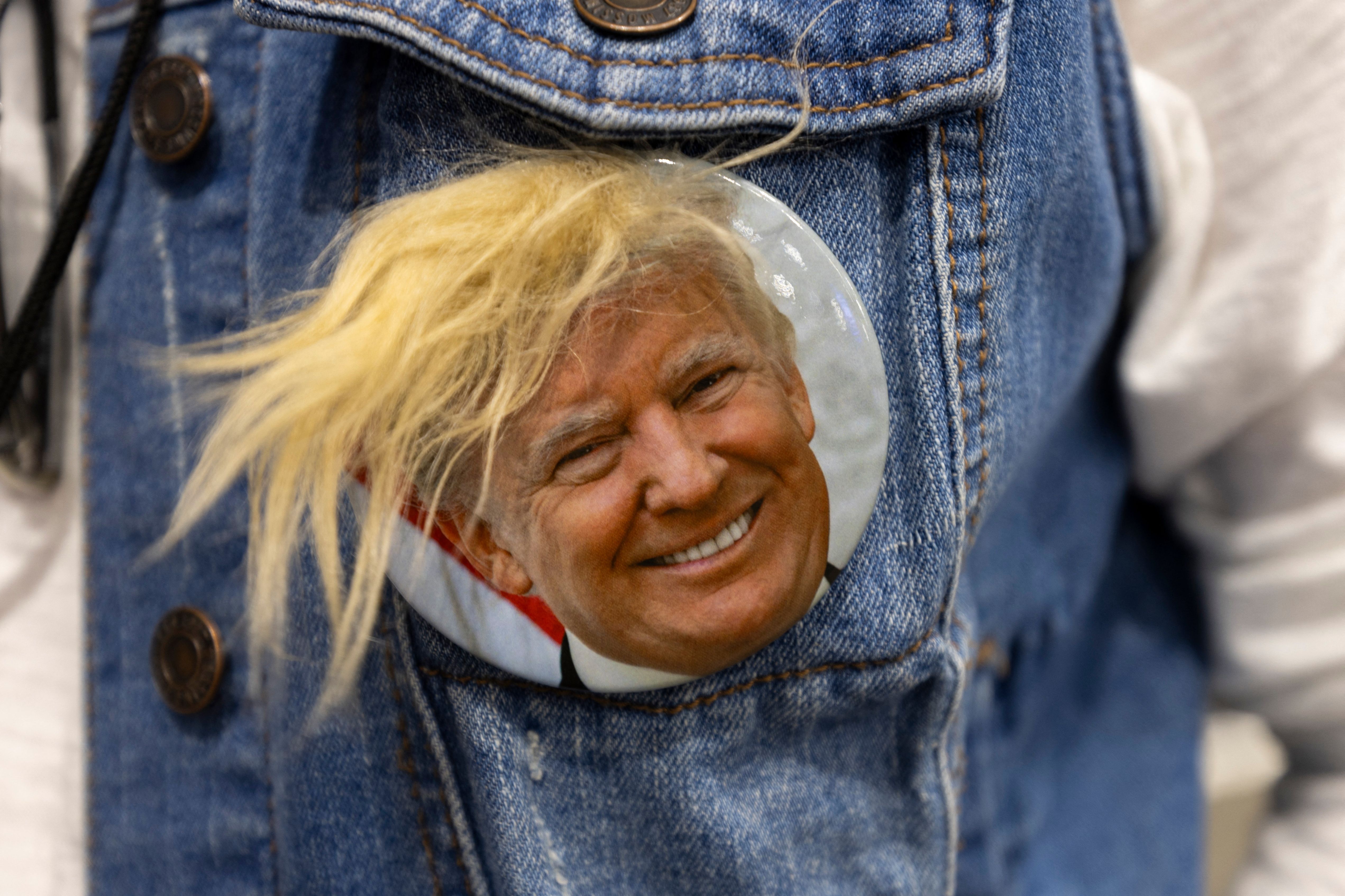 A woman wears a campaign pin at rally supporting former US President and Republican presidential candidate Donald Trump in Bozeman, Montana, on August 9, 2024. (Photo by Natalie Behring/AFP Photo)