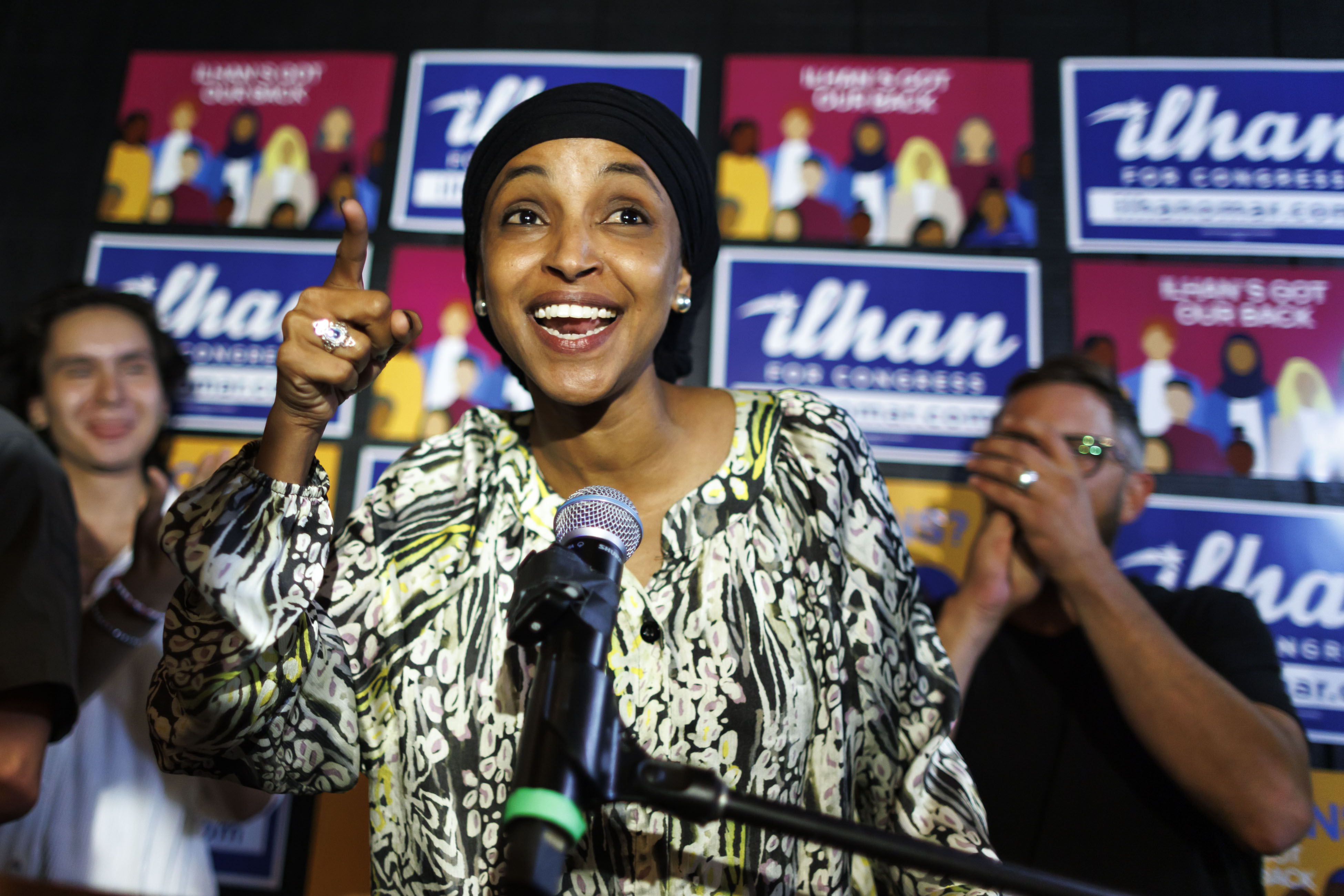 Somali-born American politician, Rep. Ilhan Omar speaks after winning the primary at Nighthawks in Minneapolis, Tuesday, August 13, 2024. (Photo by Kerem Yücel/Minnesota Public Radio via AP Photo)