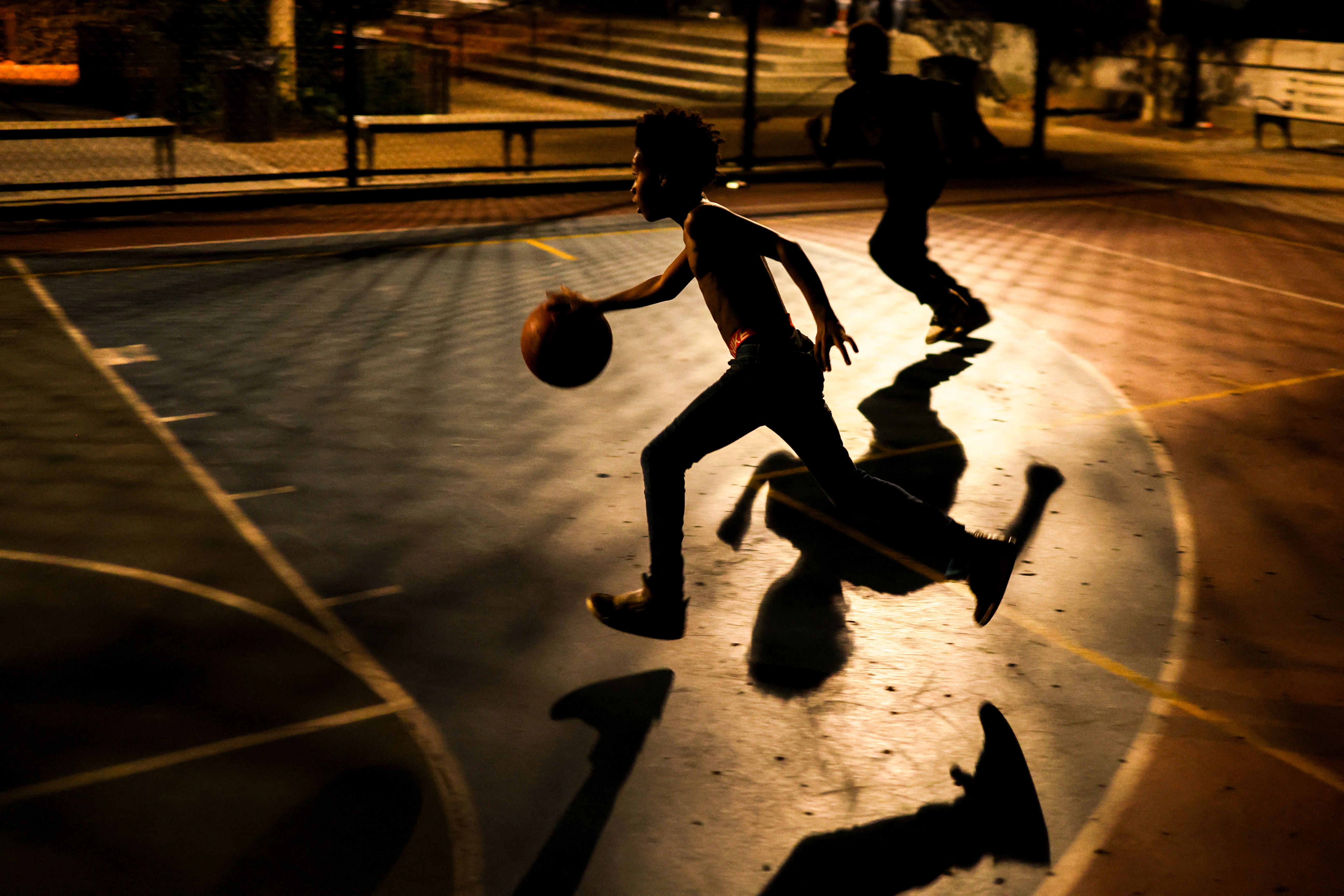 Young boys play basketball at night on a playground of Harlem in New York City on August 14, 2024. (Photo by Charly Triballeau/AFP Photo)