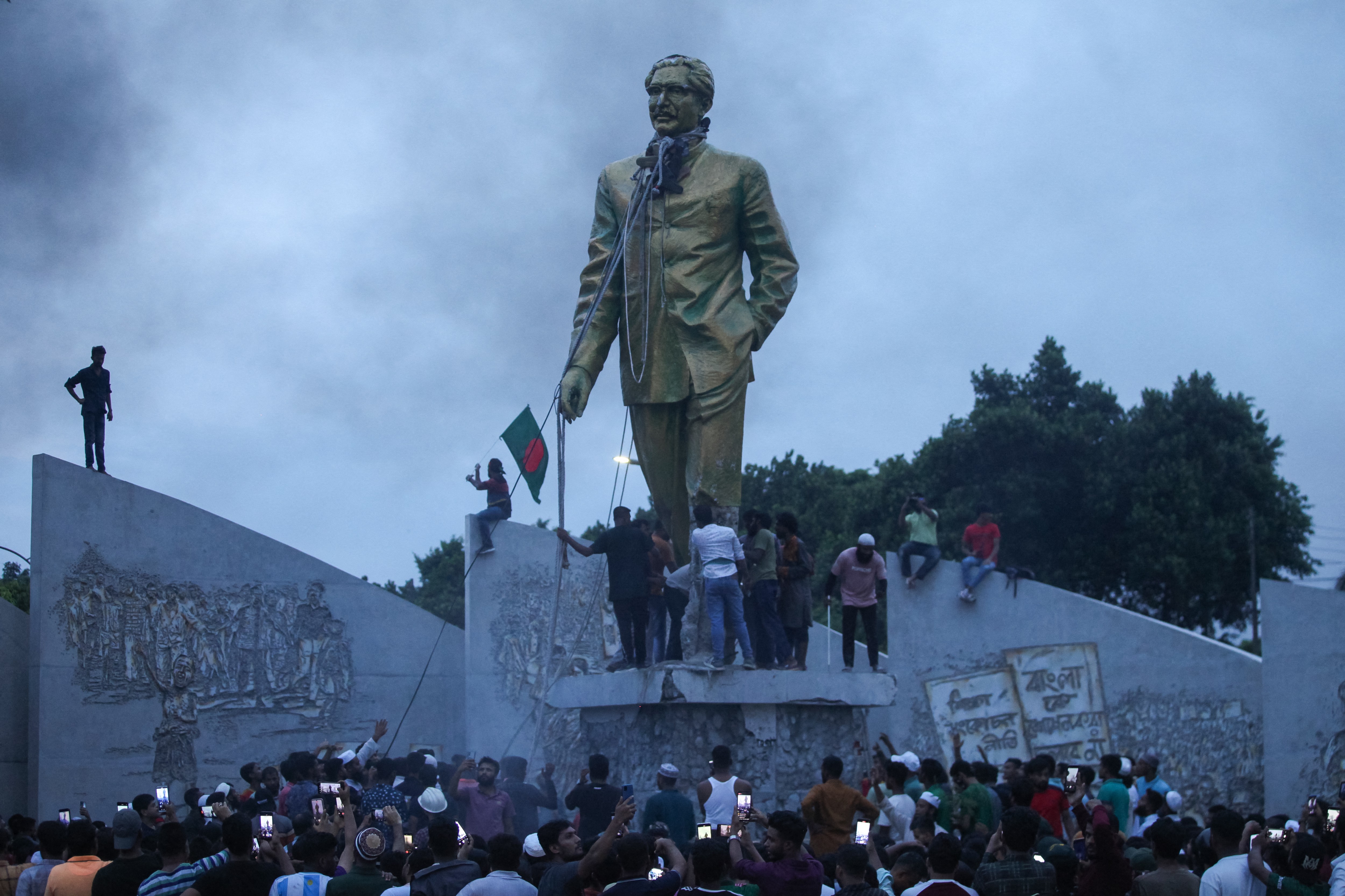 Anti-government protestors attempt to vandalise a statue of Sheikh Mujibur Rahman, Bangladesh's founding father and parent of the country's ousted Prime Minister Sheikh Hasina, in Dhaka on August 5, 2024. Bangladeshi Prime Minister Sheikh Hasina's 15-year rule ended on August 5, as she fled after more than a month of deadly protests as the military announced it would form an interim government. (Photo by Abu Sufian Jewel/AFP Photo)