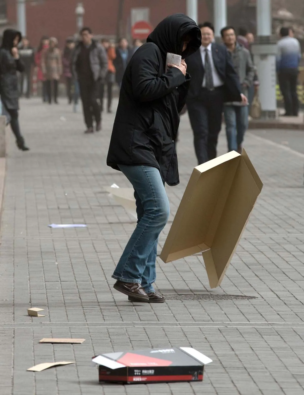 A woman covers her head while walking past a flying cardboard box after the capital city was hit by a sandstorm in Beijing Thursday, Feb. 28, 2013. (AP Photo/Andy Wong)