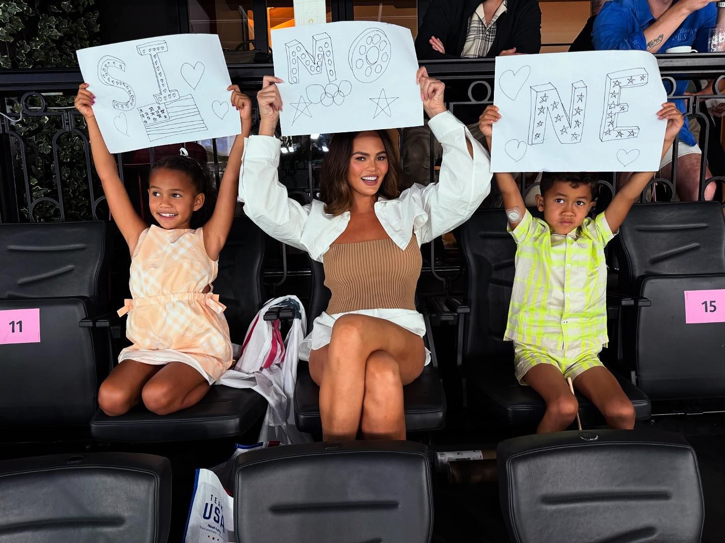 In Paris for the Olympics, American model Chrissy Teigen (center) with her kids Luna, 8, and Miles, 6, root for the US team and their favorite gymnast, Simone Biles early August 2024. (Photo by chrissy teigen/Instagram)