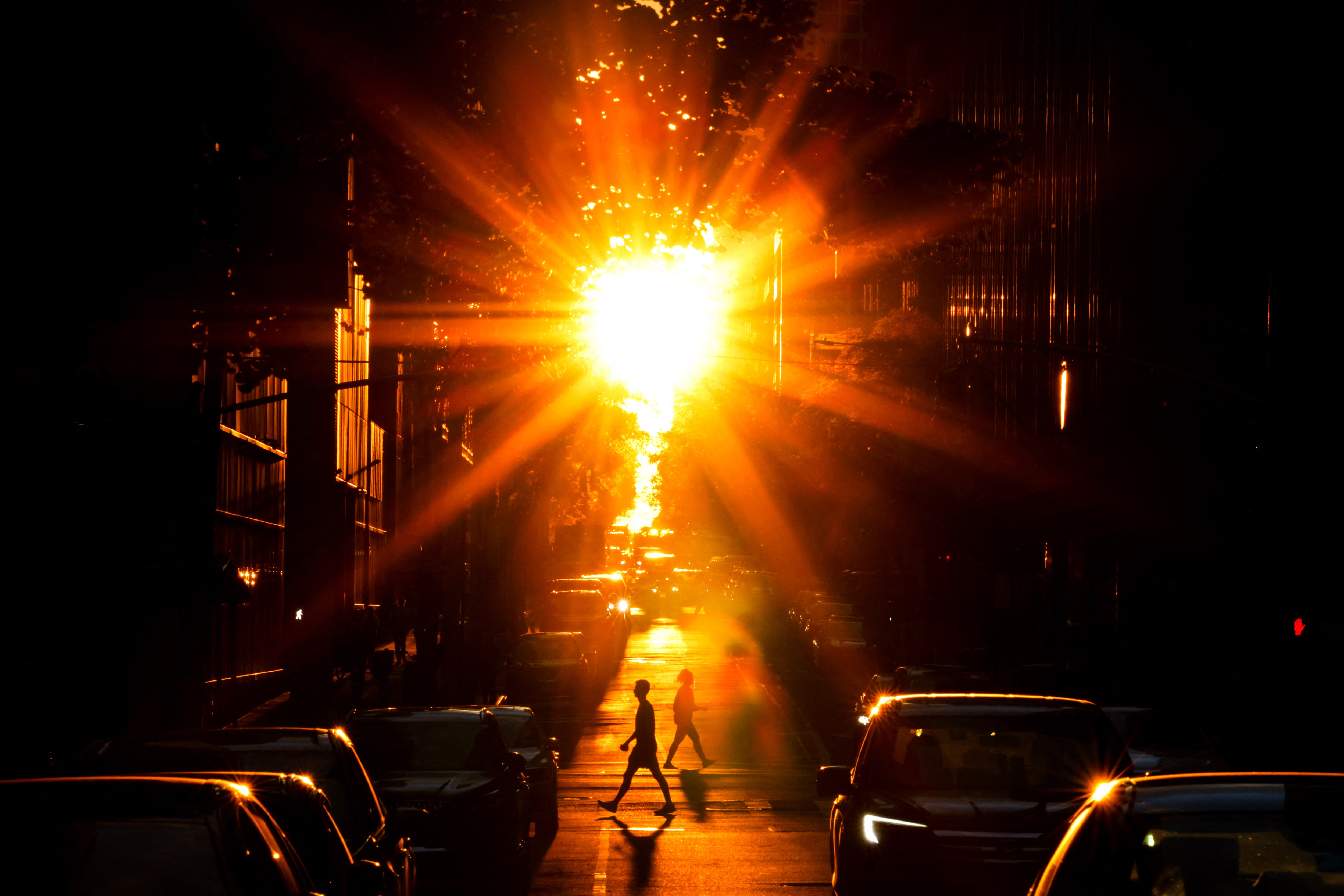People cross a street at sunset in Manhattan, New York City on June 10, 2024. (Photo by Charly Triballeau/AFP Photo)