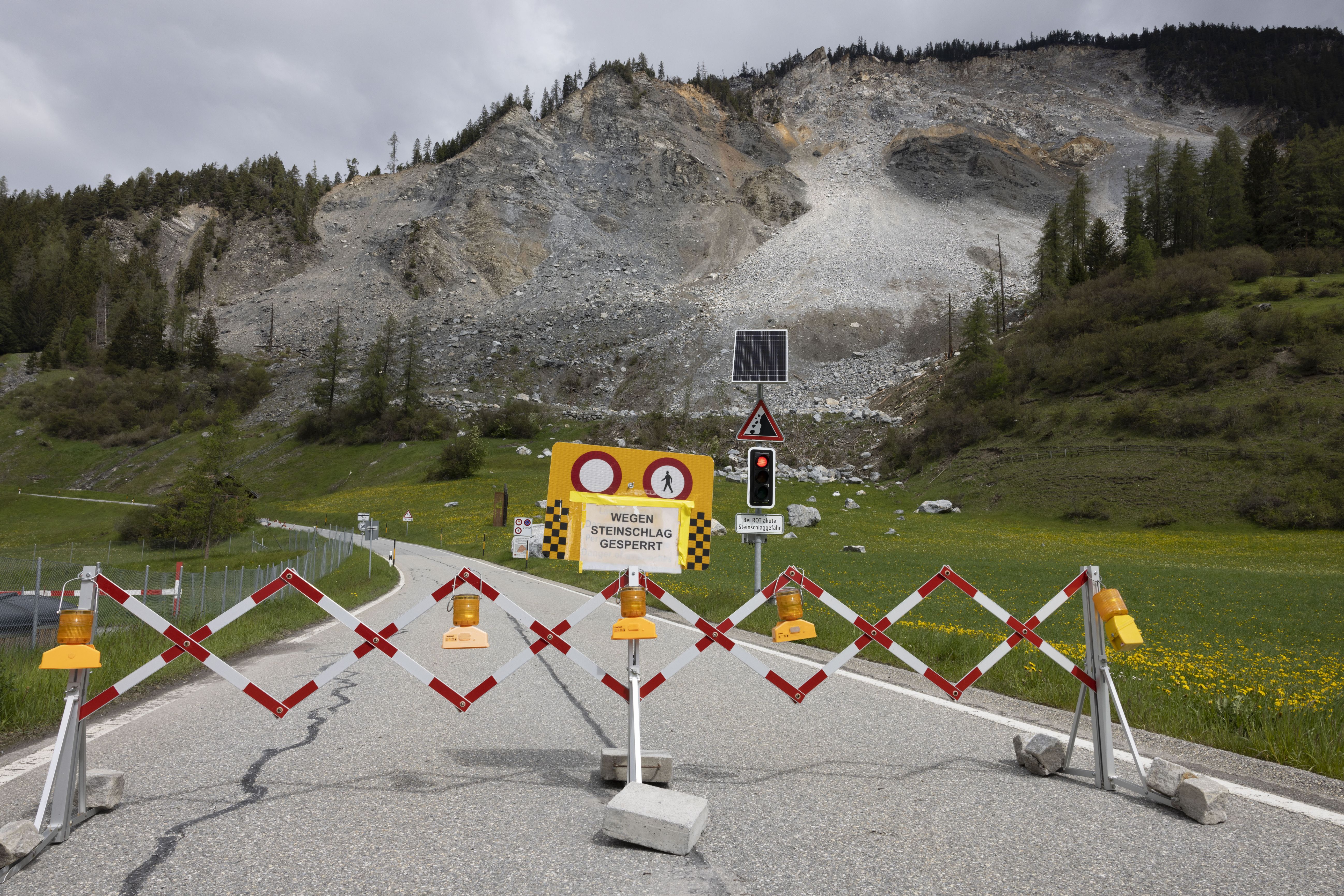 A road is blocked in front of the “Brienzer Rutsch” rockfall danger zone in Brienz-Brinzauls, Switzerland, Friday, May 12, 2023. Authorities in eastern Switzerland have ordered residents of the tiny village of Brienz to evacuate by Friday evening because geology experts say a mass of 2 million cubic meters of Alpine rock looming overhead could break loose and spill down in coming weeks. (Photo by Arnd Wiegmann/AP Photo)