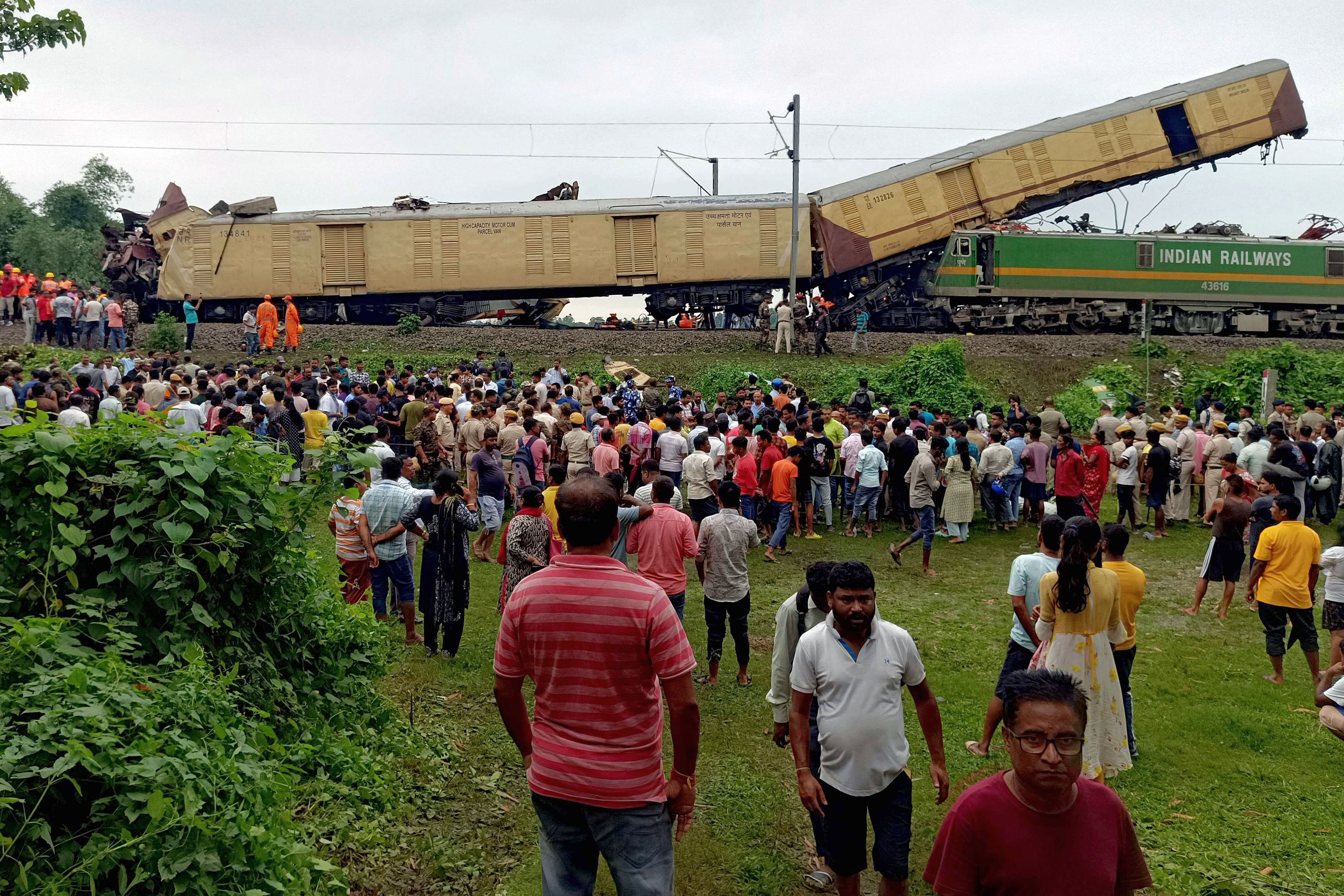 People look on at the site of a collision between an express passenger train and a goods train in Nirmaljote, near Rangapani station in India's West Bangal state on June 17, 2024. At least seven people were killed when the trains collided on June 17 in India's West Bengal state, derailing three passenger carriages, police said. (Photo by Diptendu Dutta/AFP Photo)