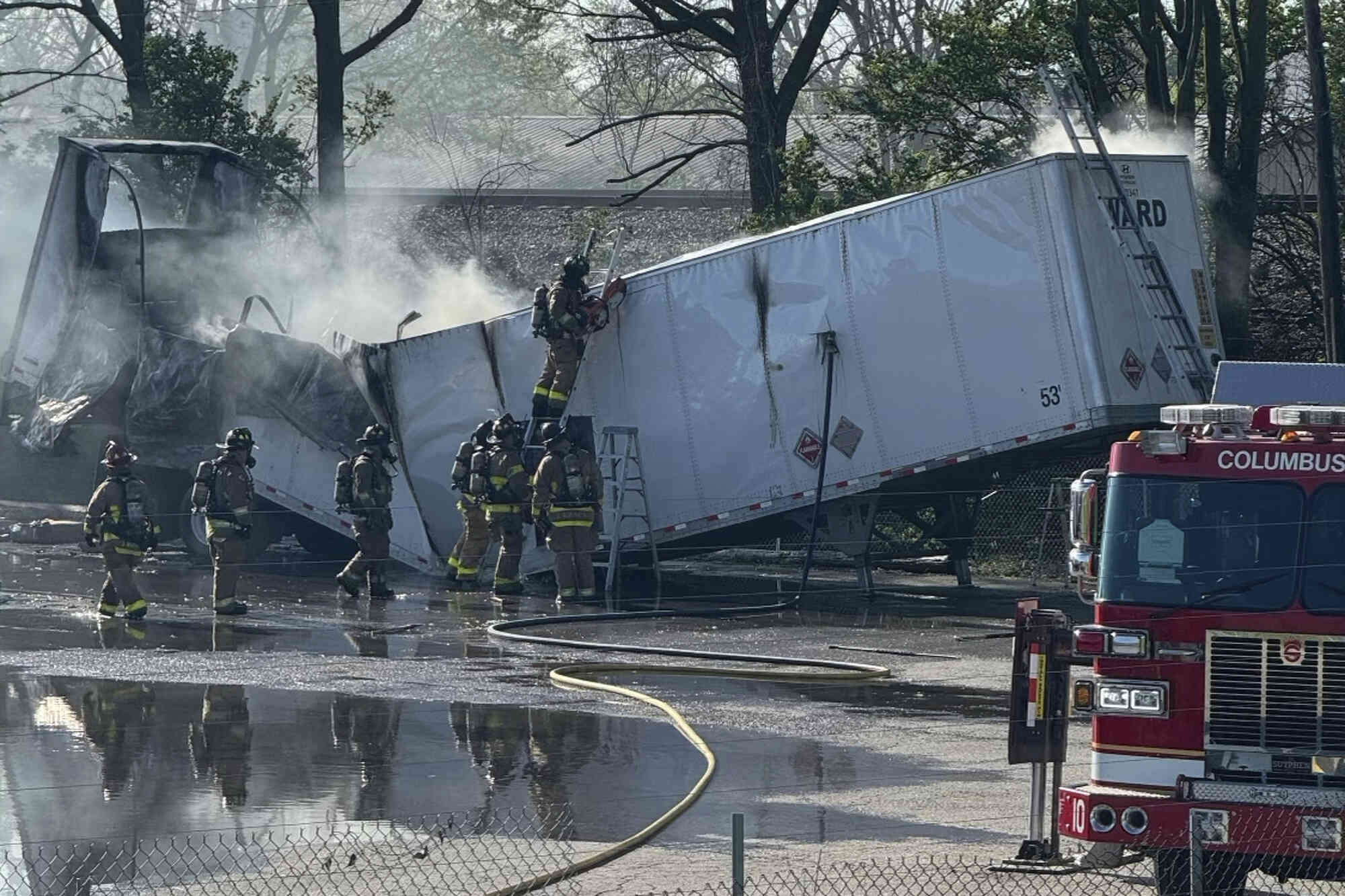 This photo released by the Columbus Fire Department shows firefighters tending to a fire that began on a trailer carrying lithium batteries in Columbus, Ohio on Thursday, April 18, 2024. (Photo by Columbus Fire Department via AP Photo)