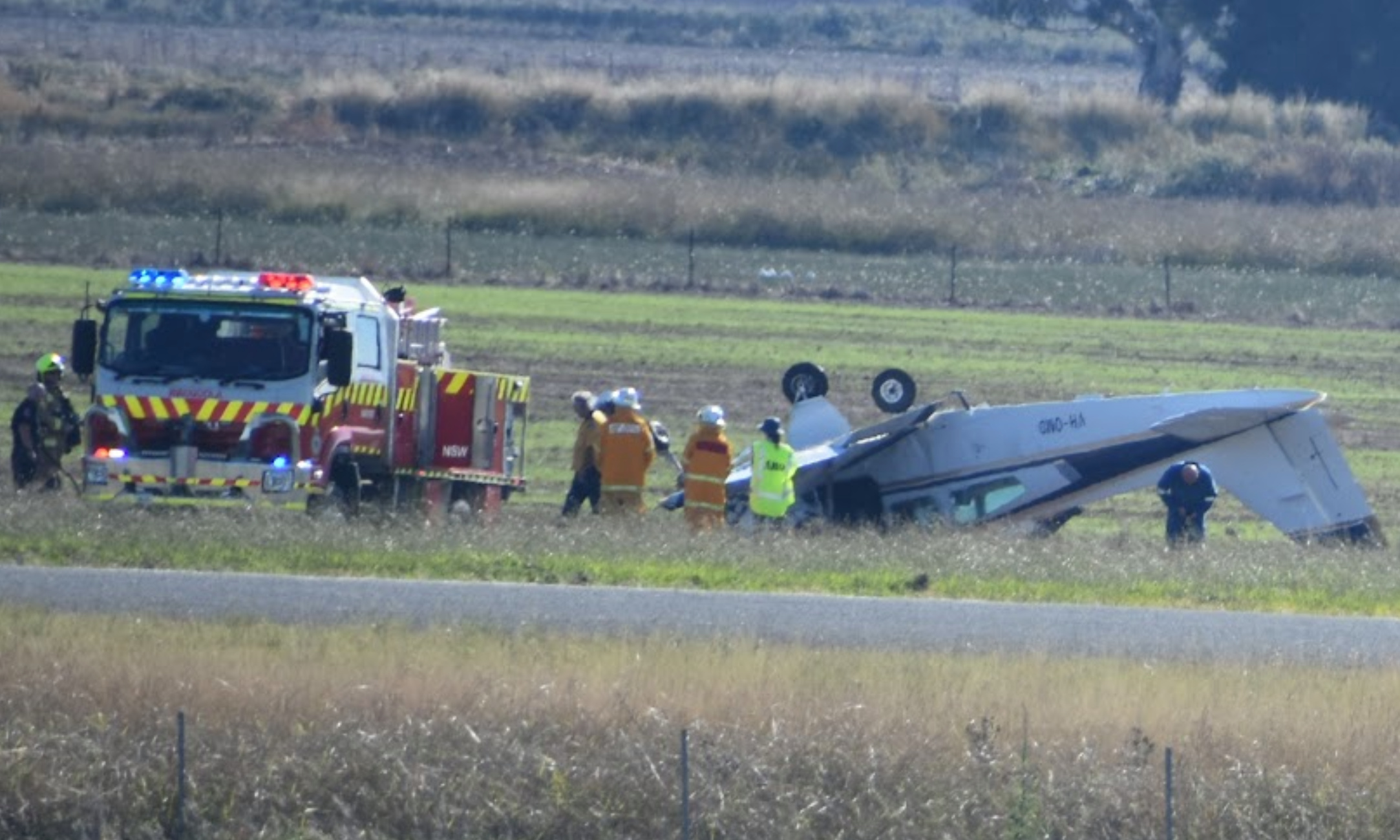 Emergency services respond to a plane crash at Cowra airport, on the New South Wales central tablelands in Cowra, Australia on April 11, 2024. The plane, which was believed to have had two occupants, is suspected to have flipped during takeoff. Neither occupant was injured. (Photo by Cara Kemp/Cowra Guardian)