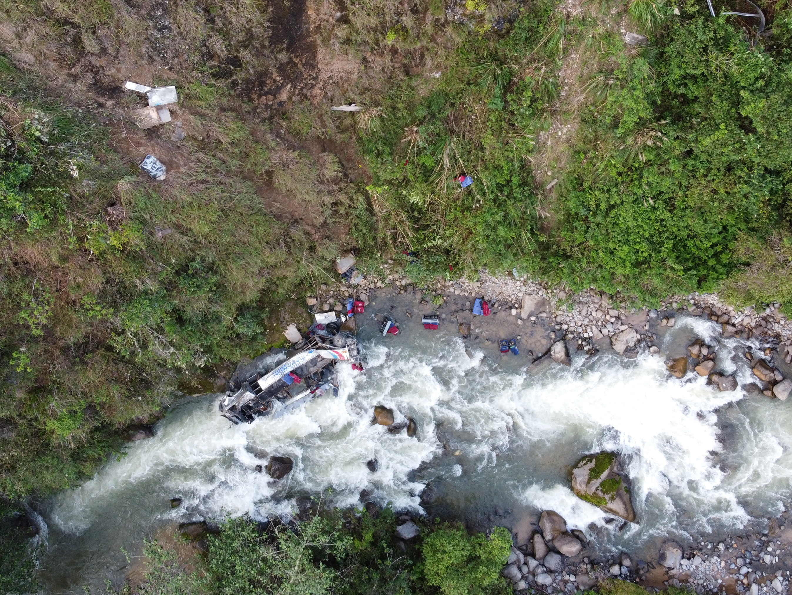 The wreckage of a passenger bus remains at the bottom of a ravine after plunging from a mountain road in the Andean region of Cajamarca, Peru, on April 29, 2024. At least 23 people died and more than a dozen were injured when a bus plunged into a ravine from a mountain road in northern Peru, local authorities said Monday. (Photo by Ismael Mantilla/AFP Photo)