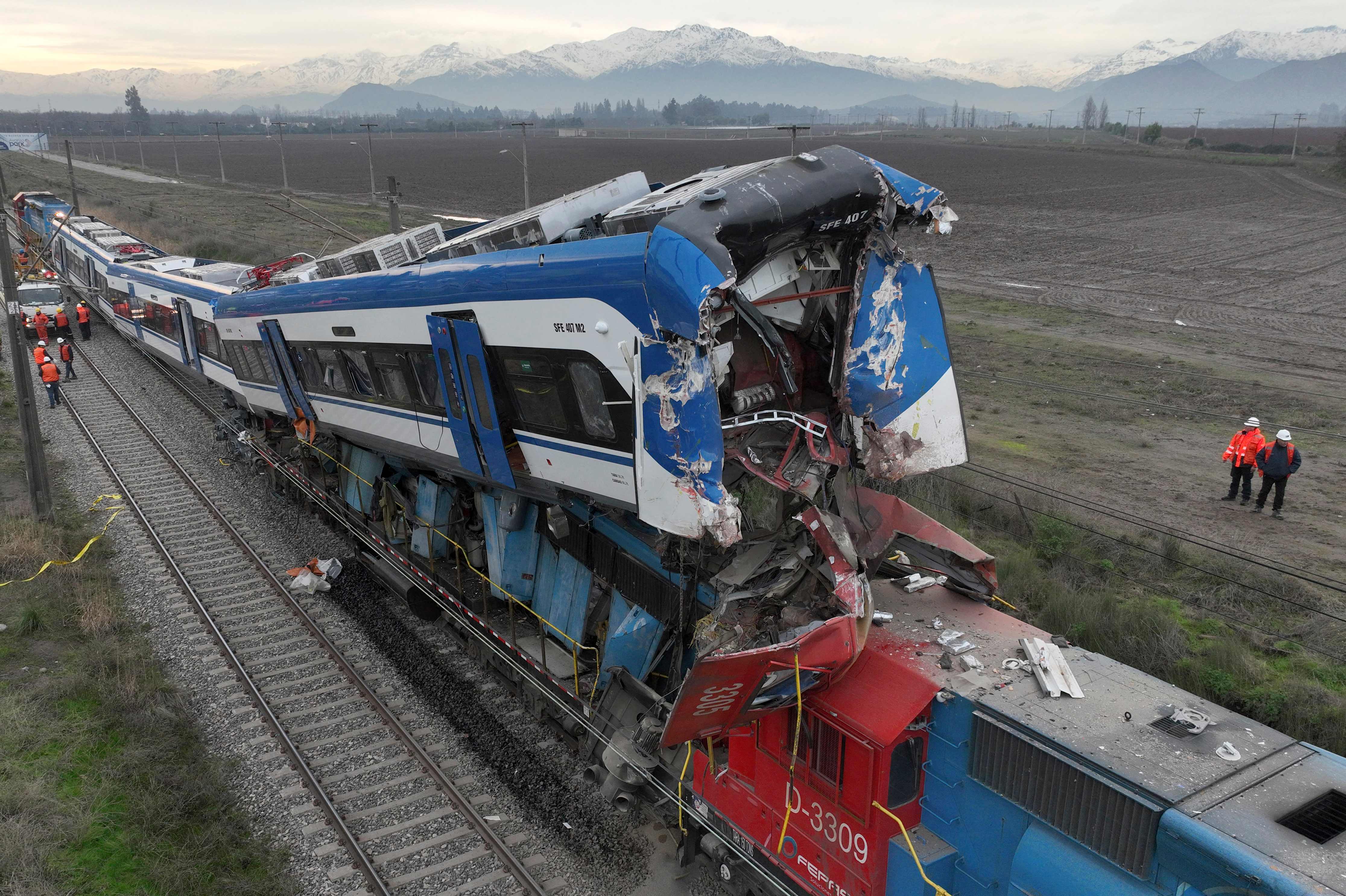 Aerial view of the two trains that collided in the commune of San Bernardo, in Santiago early in the morning on June 20, 2024. Two people were killed and several injured following the head-on collision between a goods train and a test train early in the morning on the outskirts of Chile's capital, the railway company reported. (Photo by Javier Torres/AFP Photo)