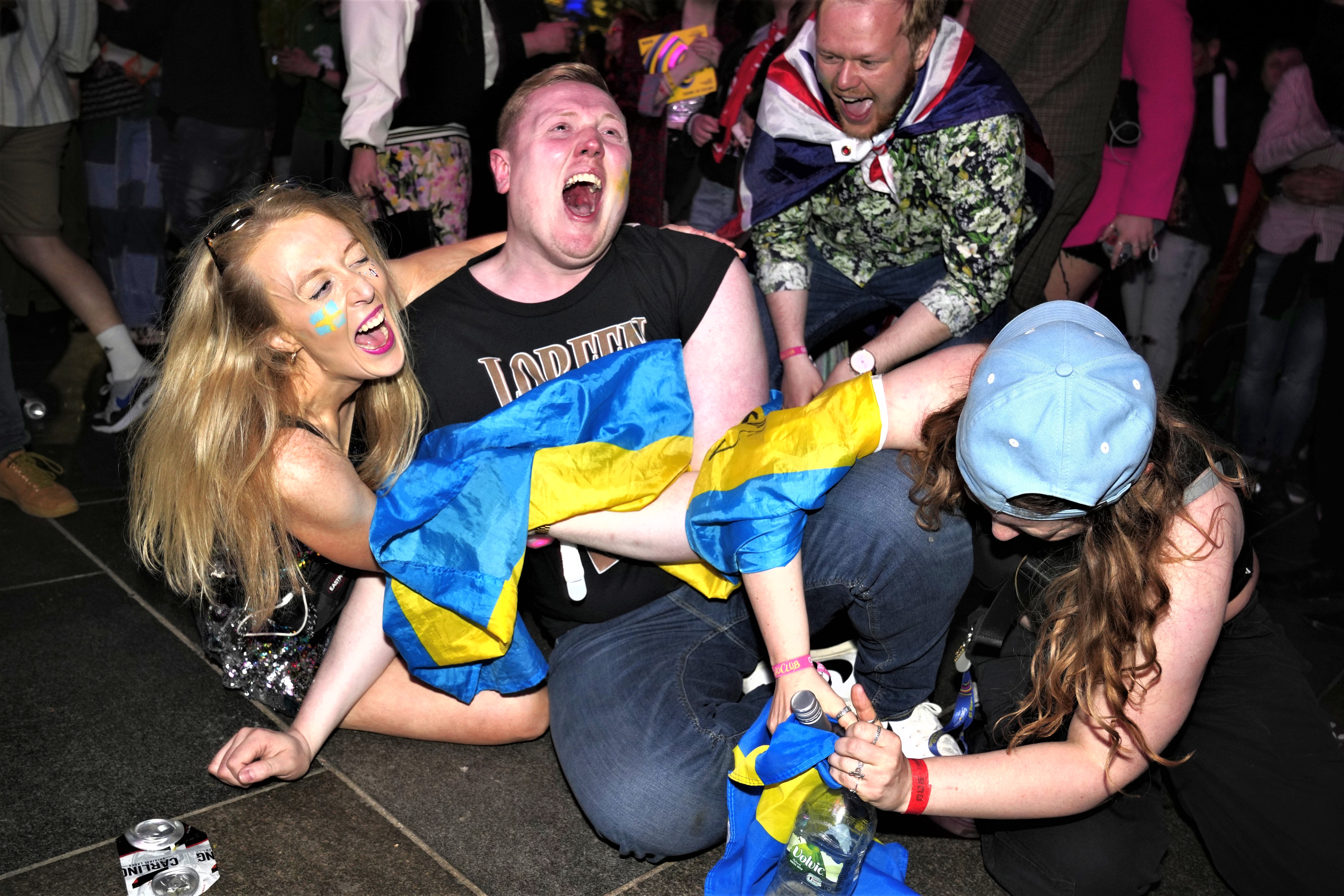 Swedish Eurovision fans in the Fan Zone react as Loreen of Sweden wins Grand Final of the Eurovision Song Contest in Liverpool, England, Saturday, May 13, 2023. (Photo by Jon Super/AP Photo)