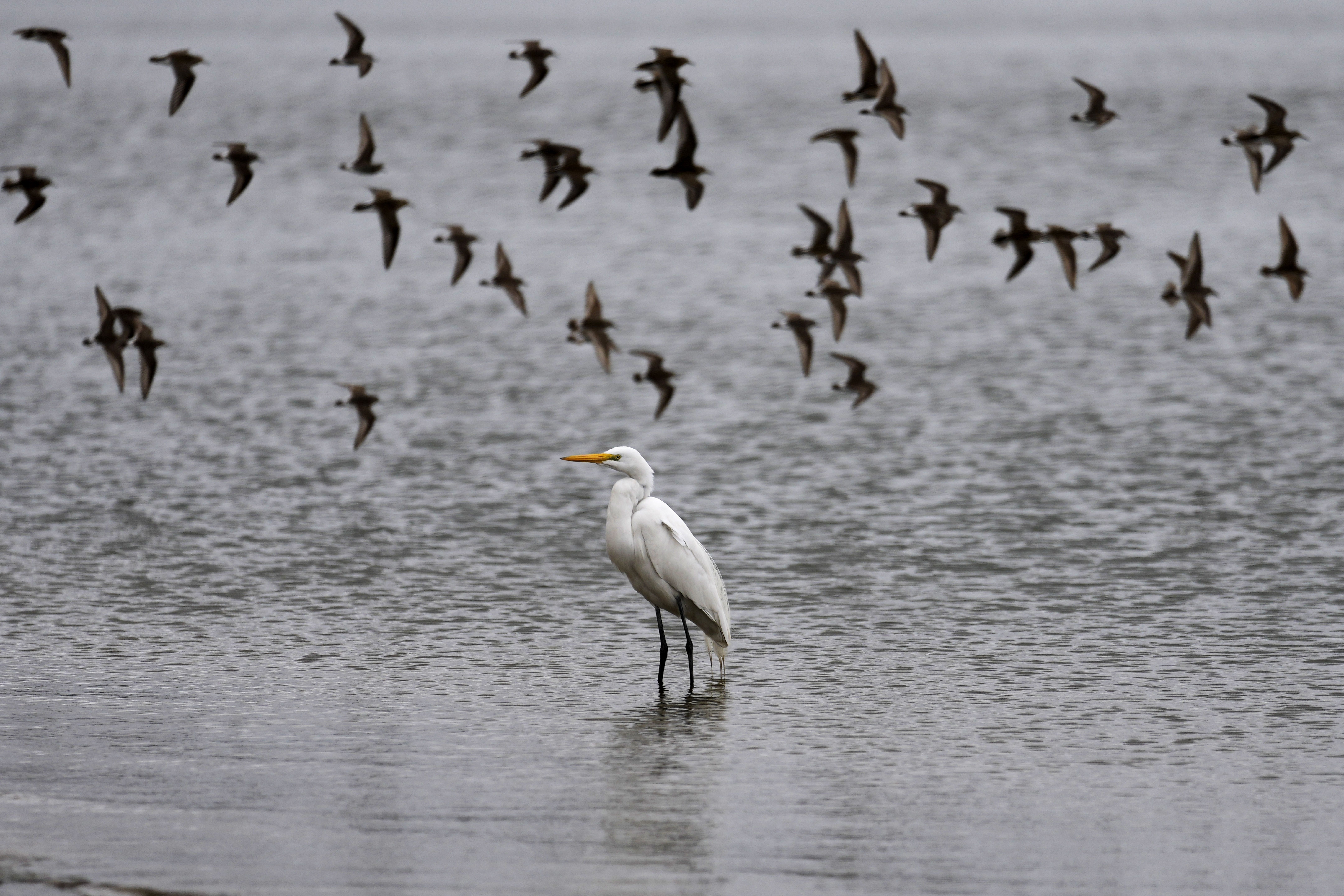An egret rest on the water´s edge as other birds fly near the port of Asuncion, amid a historic drought that is affecting the river's level, in Paraguay, Tuesday, September 21, 2021. (Photo by Jorge Saenz/AP Photo)