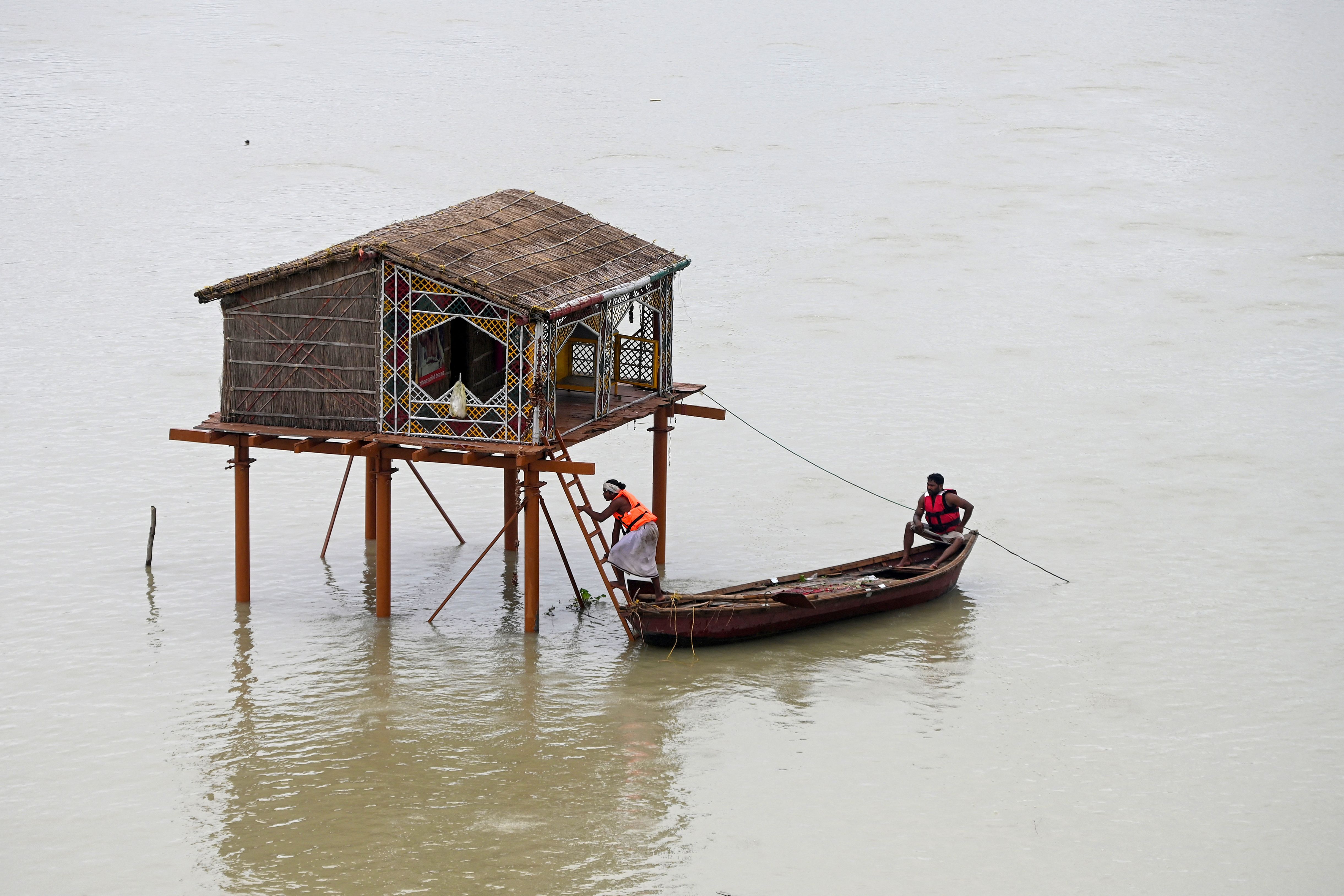 Men row a boat near a deluged straw hut in the river Ganges in Prayagraj on August 7, 2024, after rise in water levels during the monsoons. (Photo by Sanjay Kanojia/AFP Photo)