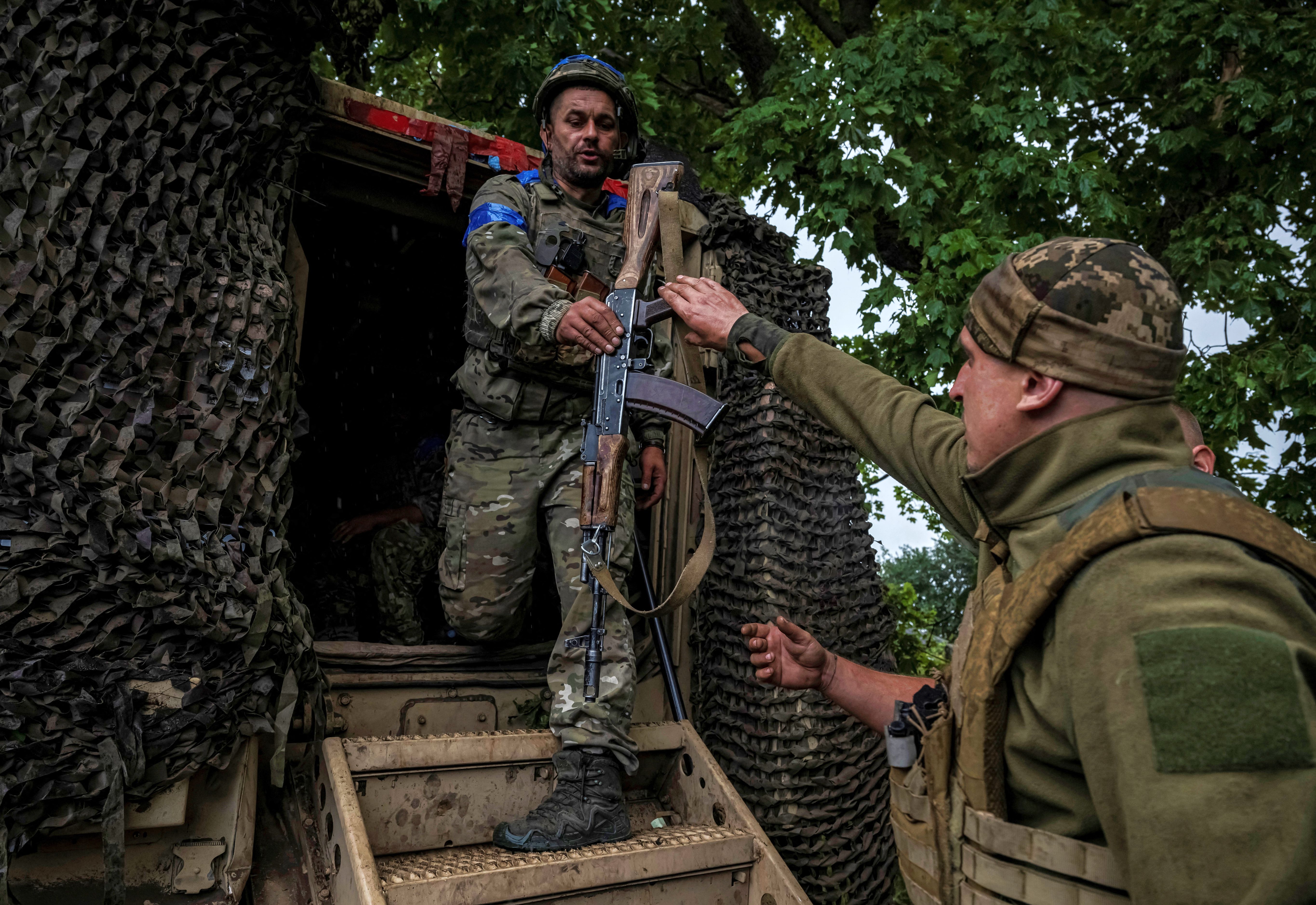 Ukrainian servicemen get out of an armoured personnel carrier, near the Russian border in Sumy region, Ukraine on August 13, 2024. (Photo by Viacheslav Ratynskyi/Reuters)