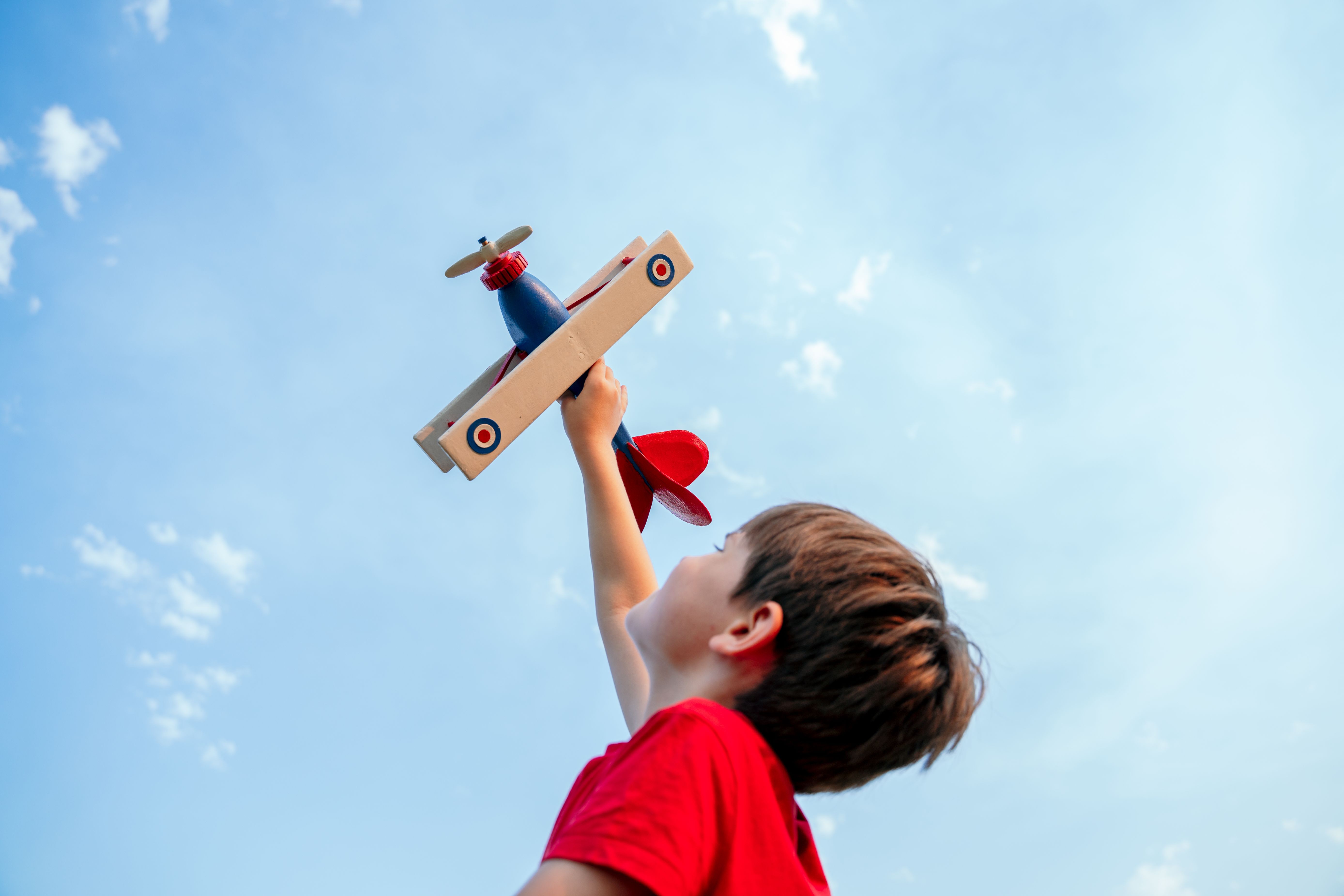 Low angle view of little boy flying in the blue sky a handmade wooden airplane. Childhood and travel concept. (Photo by Vera Vita/Getty Images)