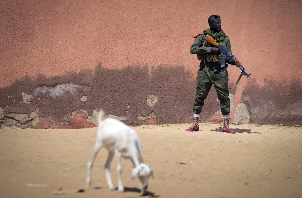 Malian army soldier Sekou Bolly, 30, holds an AK-47 assault rifle as he patrols in Gao, on February 25, 2013. (Photo by Joel Saget/AFP Photo via The Atlantic)