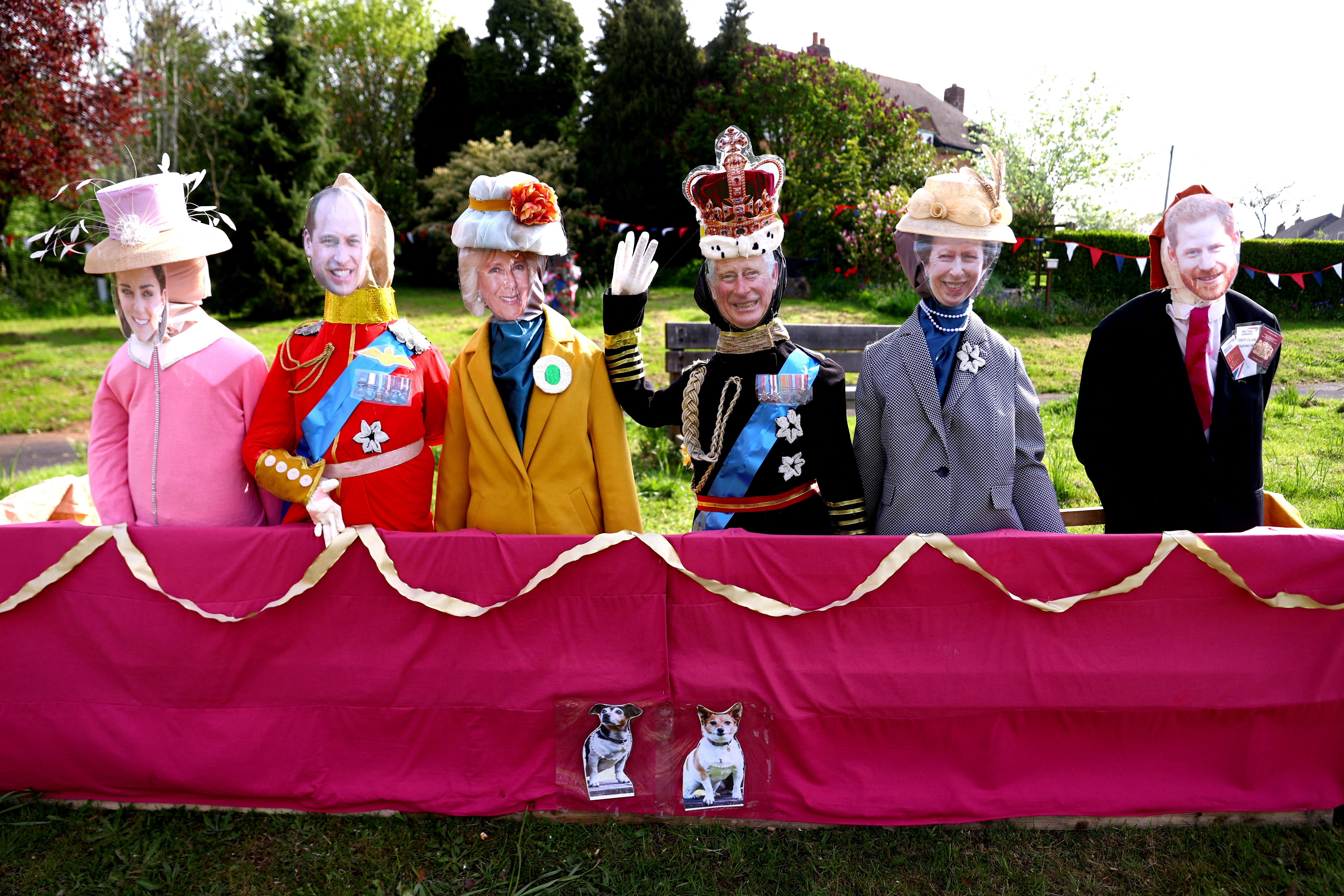 Britain's Royal Family scarecrows standing on a balcony are pictured in the village of Sheriffhales, Shifnal, Shropshire, Britain on May 4, 2023. (Photo by Carl Recine/Reuters)