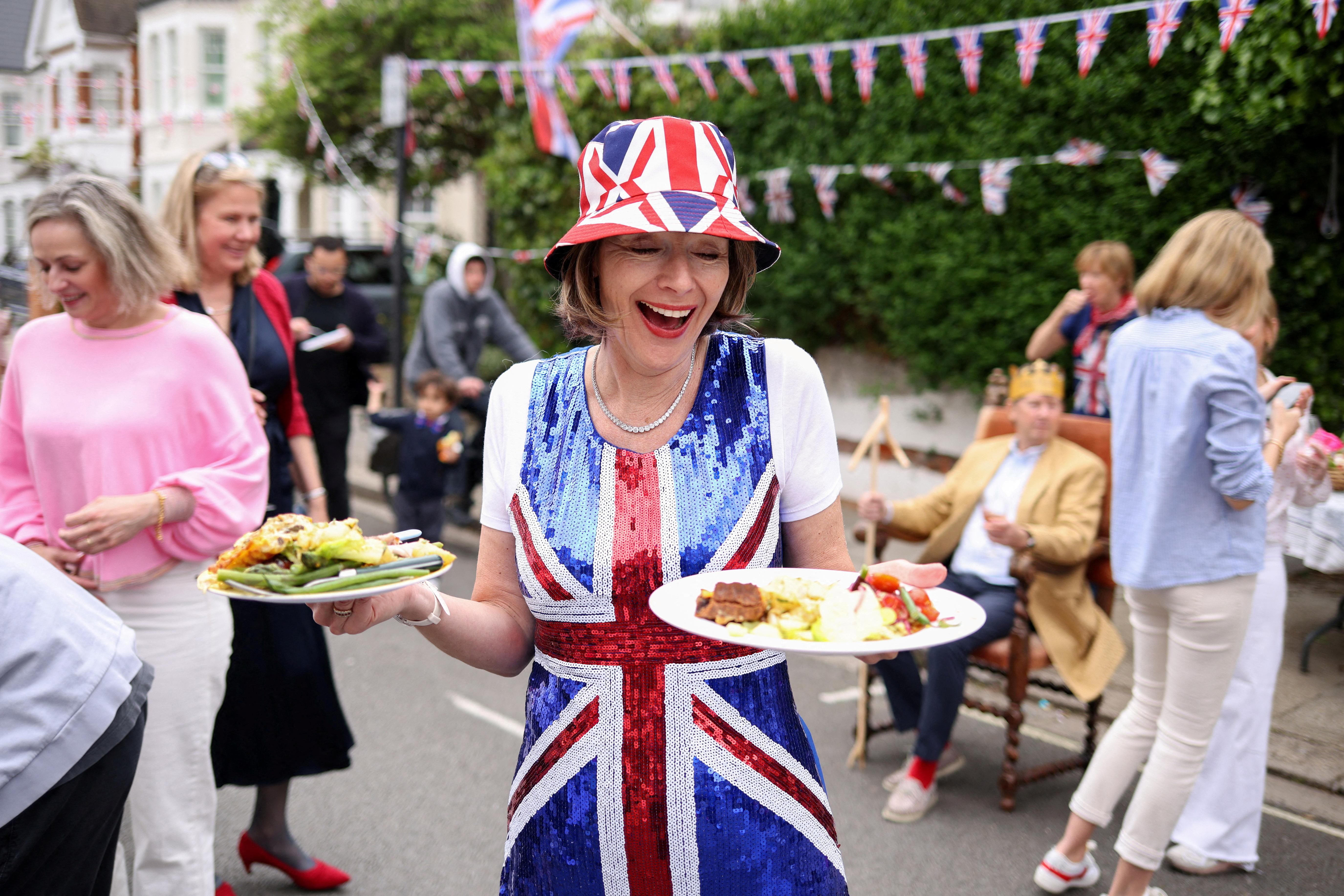 Sophie Graham carries plates of food at a Big Lunch event to celebrate the coronation of Britain's King Charles, in Napier Avenue in Fulham, London, Britain on May 7, 2023. (Photo by Kevin Coombs/Reuters)