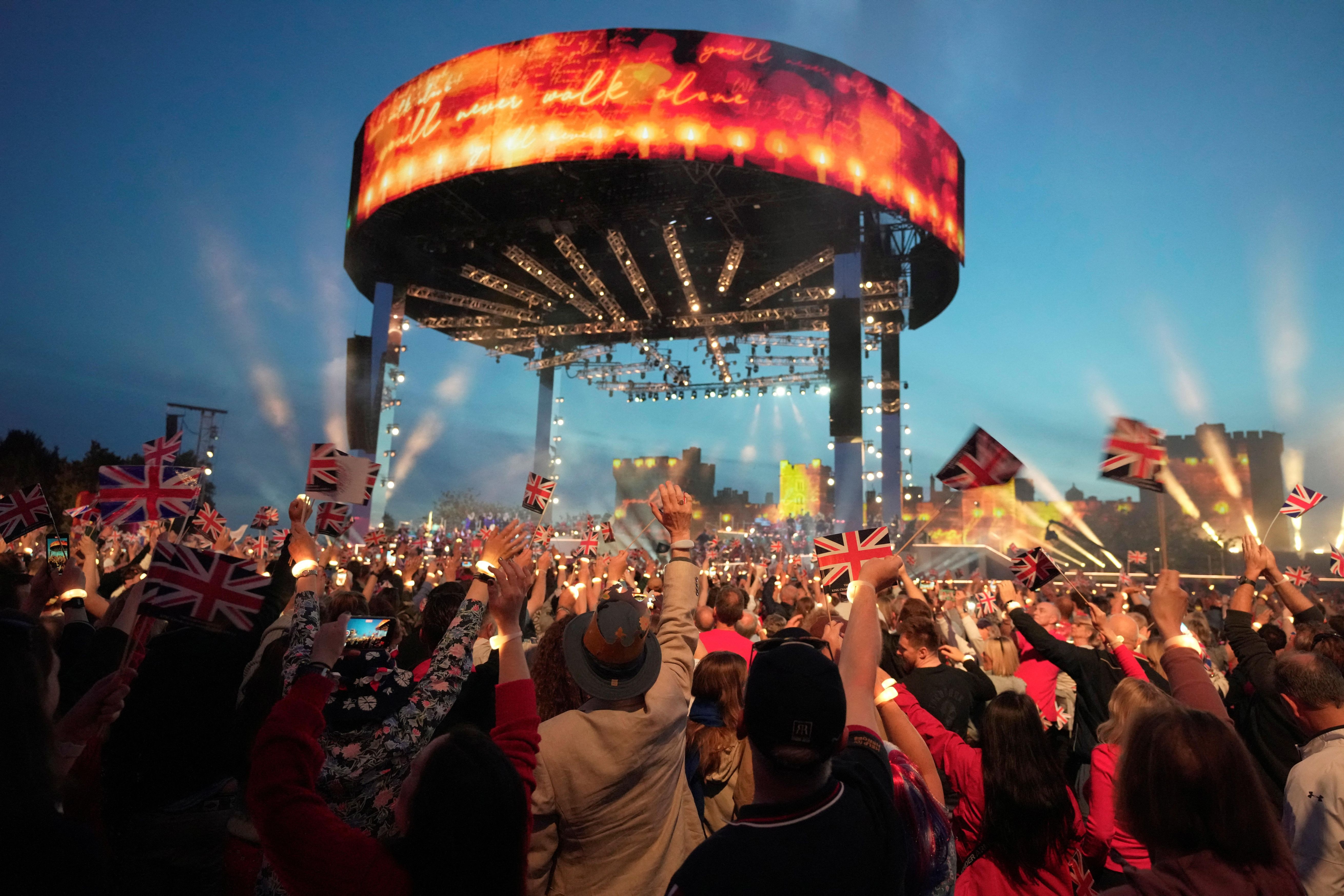 Crowds watch performers inside Windsor Castle grounds during the Coronation Concert, in Windsor, west of London on May 7, 2023. For the first time ever, the East Terrace of Windsor Castle will host a spectacular live concert that will also be seen in over 100 countries around the world. The event will be attended by 20,000 members of the public from across the UK. (Photo by Kin Cheung/Pool via AFP Photo)