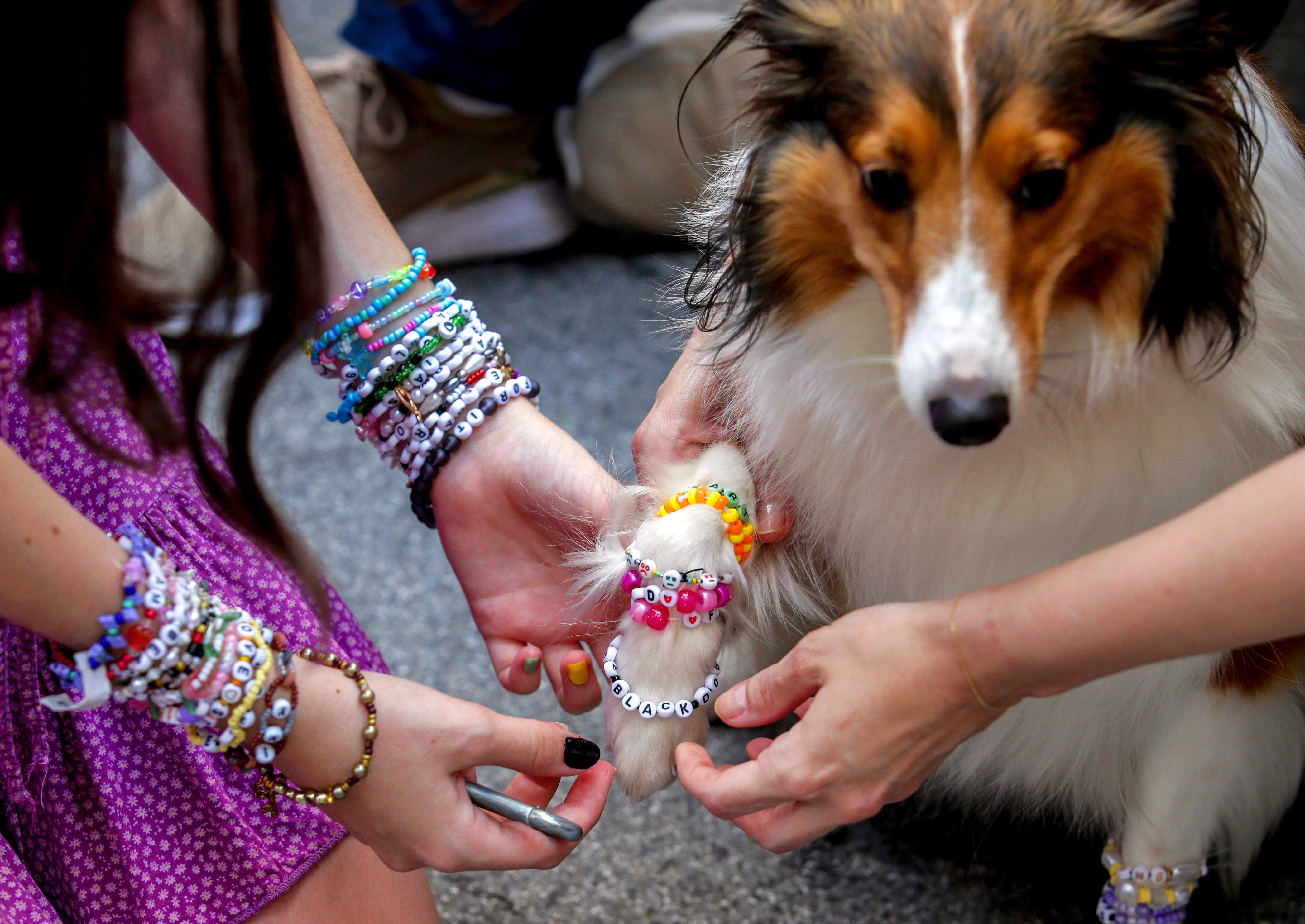 A dog is decorated with bracelets in the city centre in Vienna on Thursday, August 8, 2024. Organizers of three Taylor Swift concerts in the stadium in Vienna this week called them off on Wednesday after officials announced arrests over an apparent plot to launch an attack on an event in the Vienna area such as the concerts. (Photo by Heinz-Peter Bader/AP Photo)