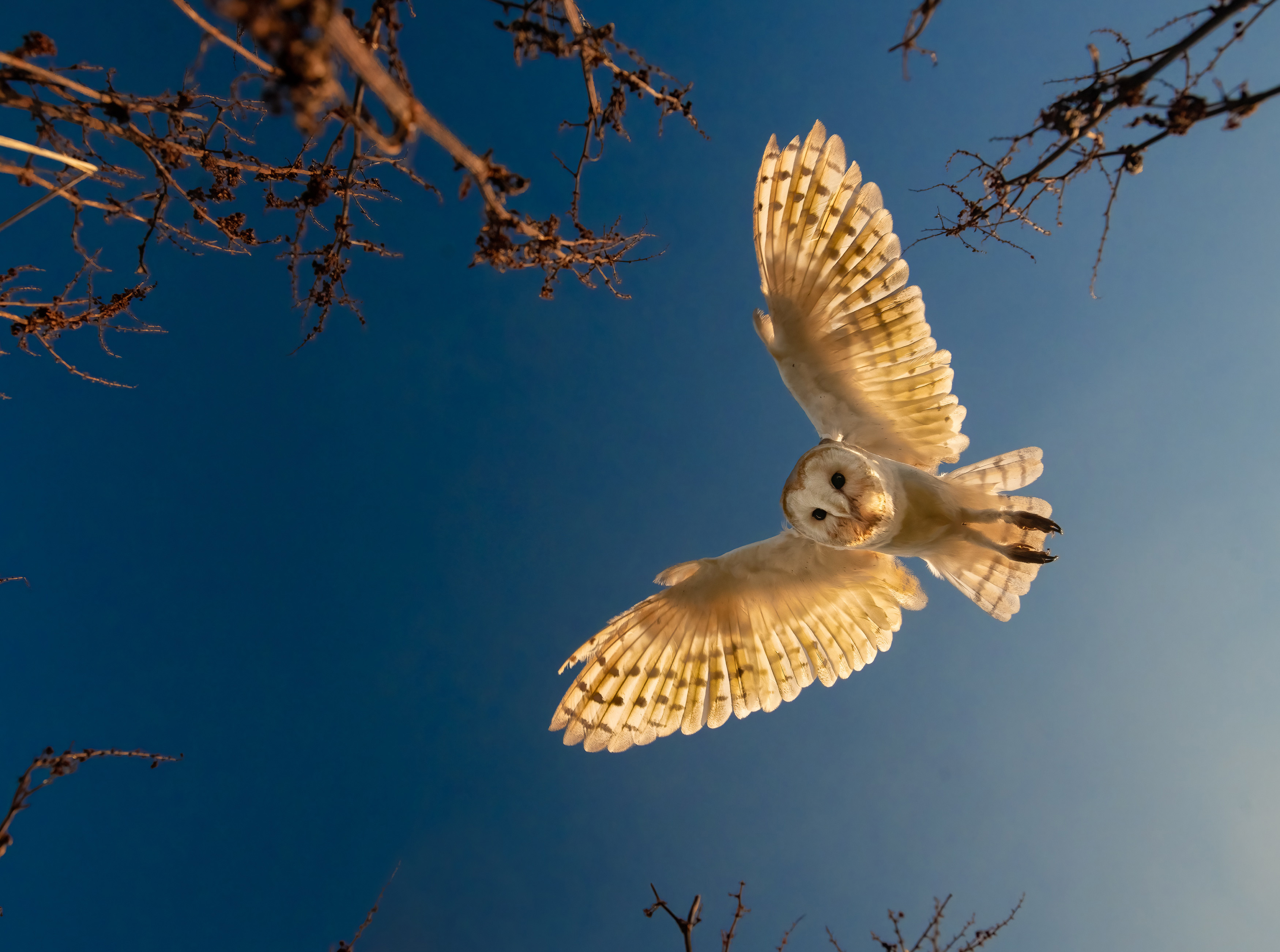 A barn owl peers down towards the camera, seen from a vole’s-eye view while hunting at dusk in Cheshire, UK in the second decade of August 2024. (Photo by David Akers/Solent News)