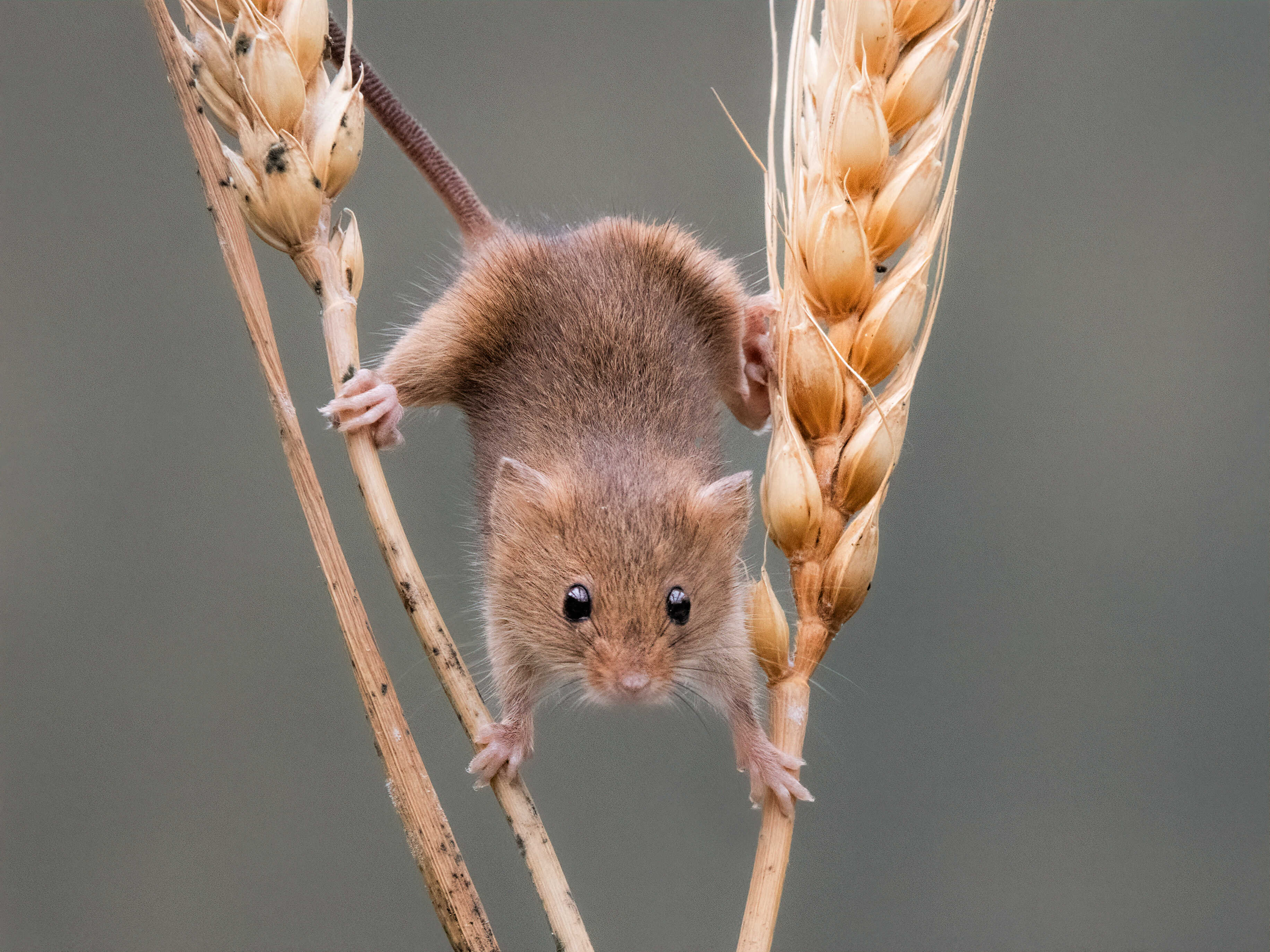 A harvest mouse balances between two stalks of wheat near Burnley, Lancashire, UK in the second decade of August 2024. (Photo by Vicky Outen/Media Drum Images)