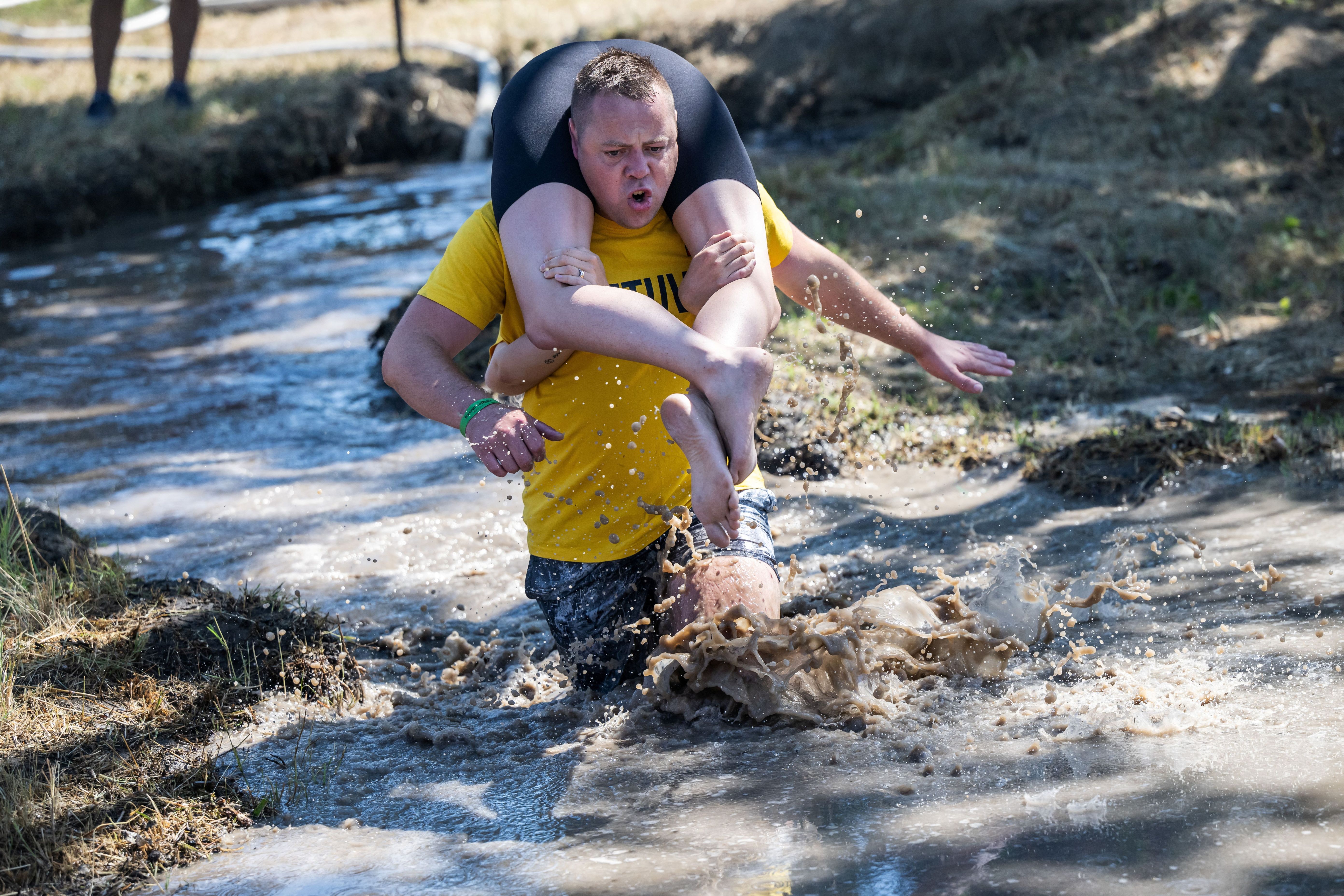 Participants compete in a wife-carrying championship in Tapiobicske, Hungary on August 10, 2024. (Photo by Marton Monus/Reuters)