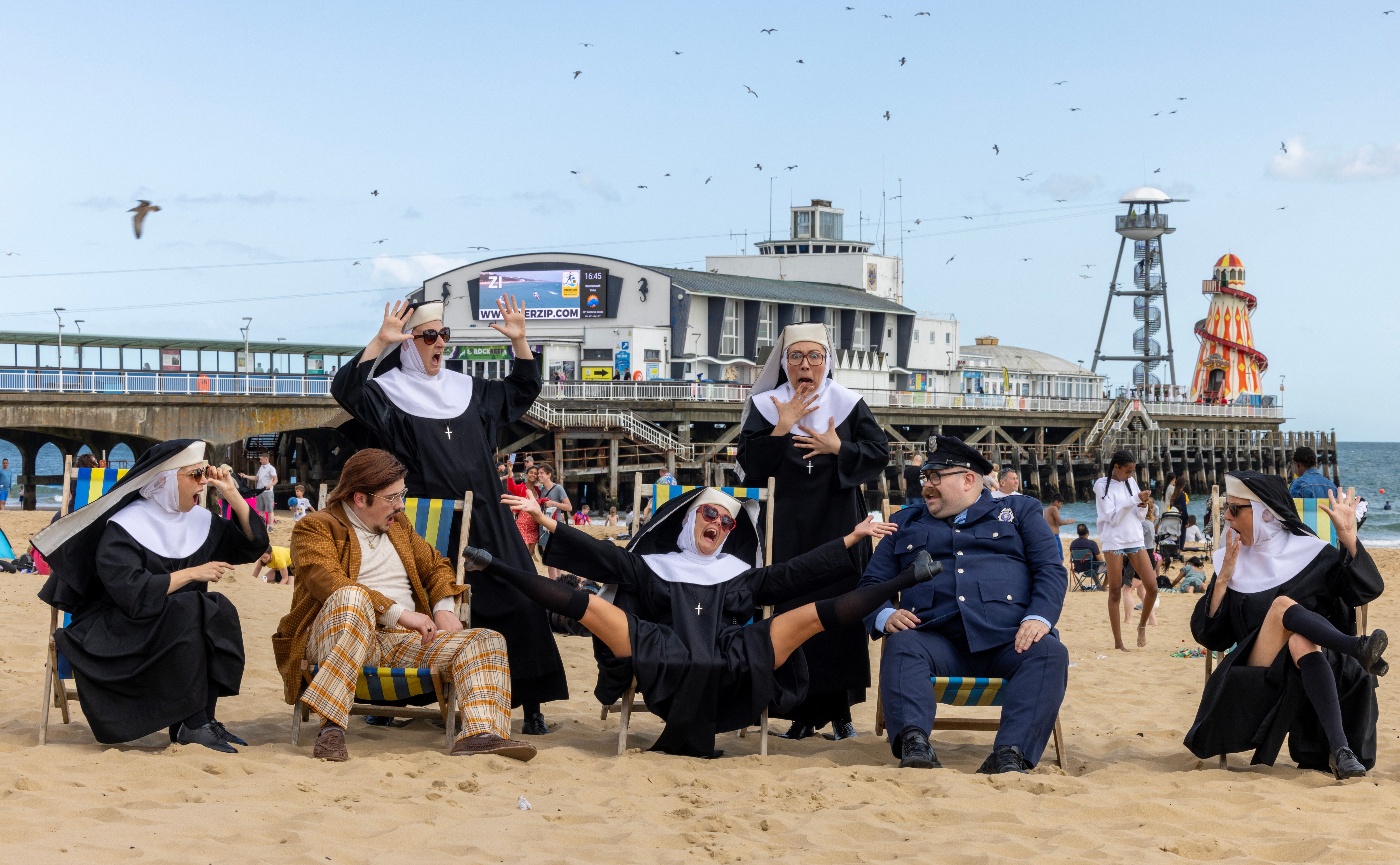 The cast of Sister Act take a break from performances at the Pavilion Theatre in Bournemouth, UK in the second decade of August 2024, with some members getting a little too relaxed. (Photo by Corin Messer/BNPS)
