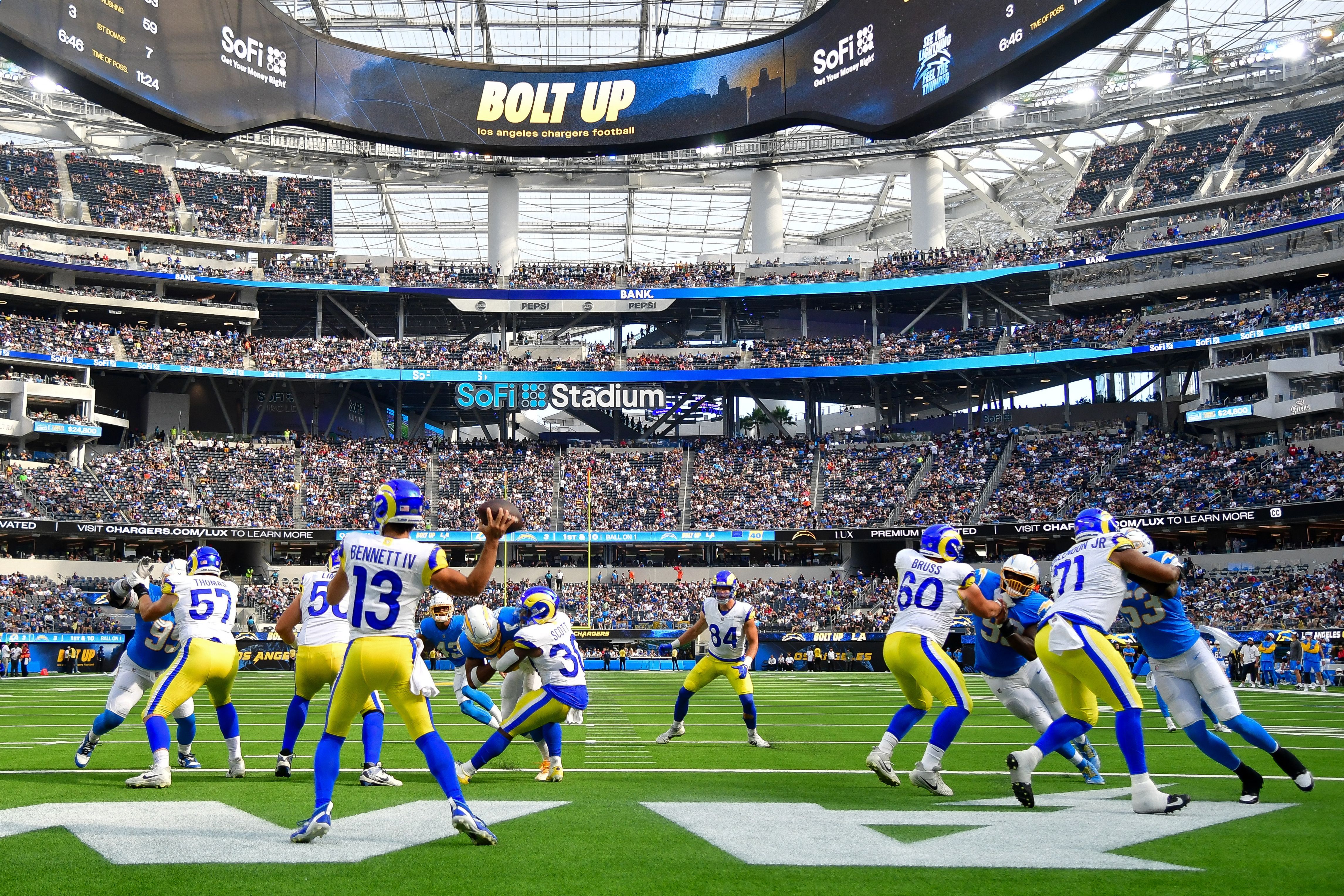 Stetson Bennett, a quarterback for the Los Angeles Rams, drops back to pass during the first half of play against the Los Angeles Chargers in the NFL preseason at SoFi Stadium in Inglewood, California on August 17, 2024. (Photo by Gary A Vasquez/USA TODAY Sports via Reuters)