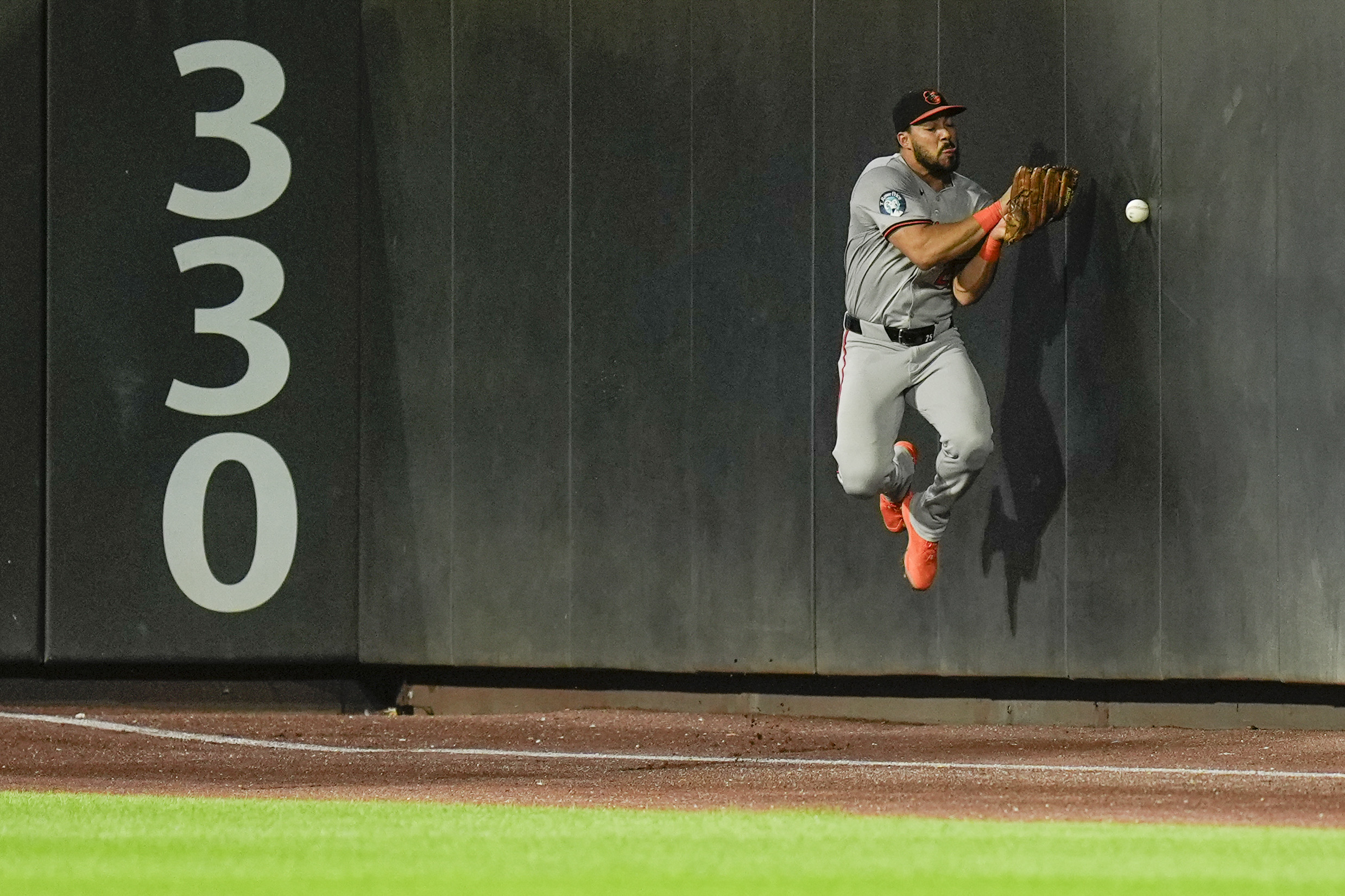 Baltimore Orioles outfielder Anthony Santander tries to catch a foul ball during the fourth inning of a baseball game against the New York Mets at Citi Field, Monday, August 19, 2024, in New York. (Photo by Seth Wenig/AP Photo)