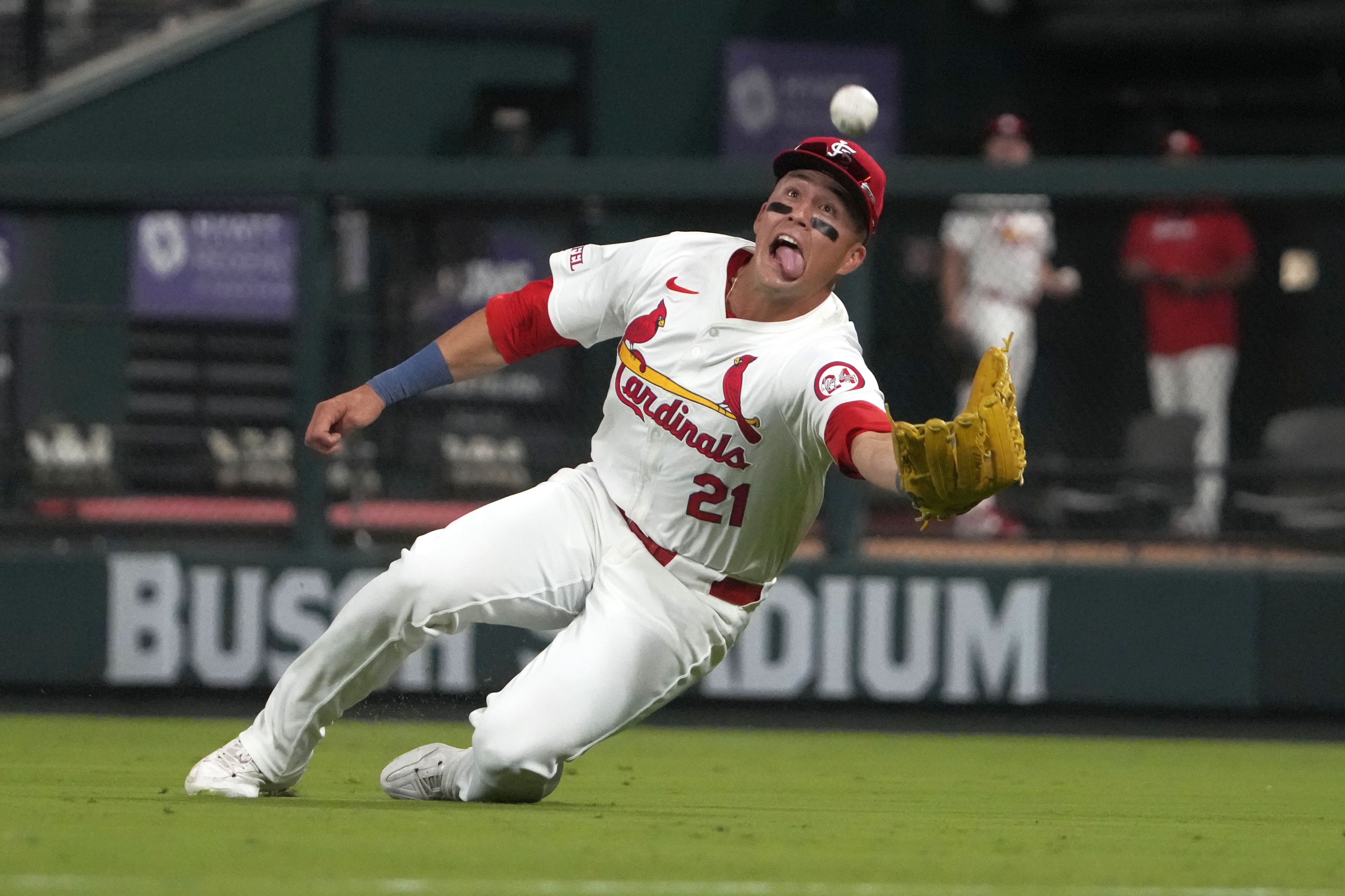 St. Louis Cardinals right fielder Lars Nootbaar dives and catches a fly ball by Milwaukee Brewers' Joey Ortiz for an out during the seventh inning of a baseball game Tuesday, August 20, 2024, in St. Louis. (Photo by Jeff Roberson/AP Photo)