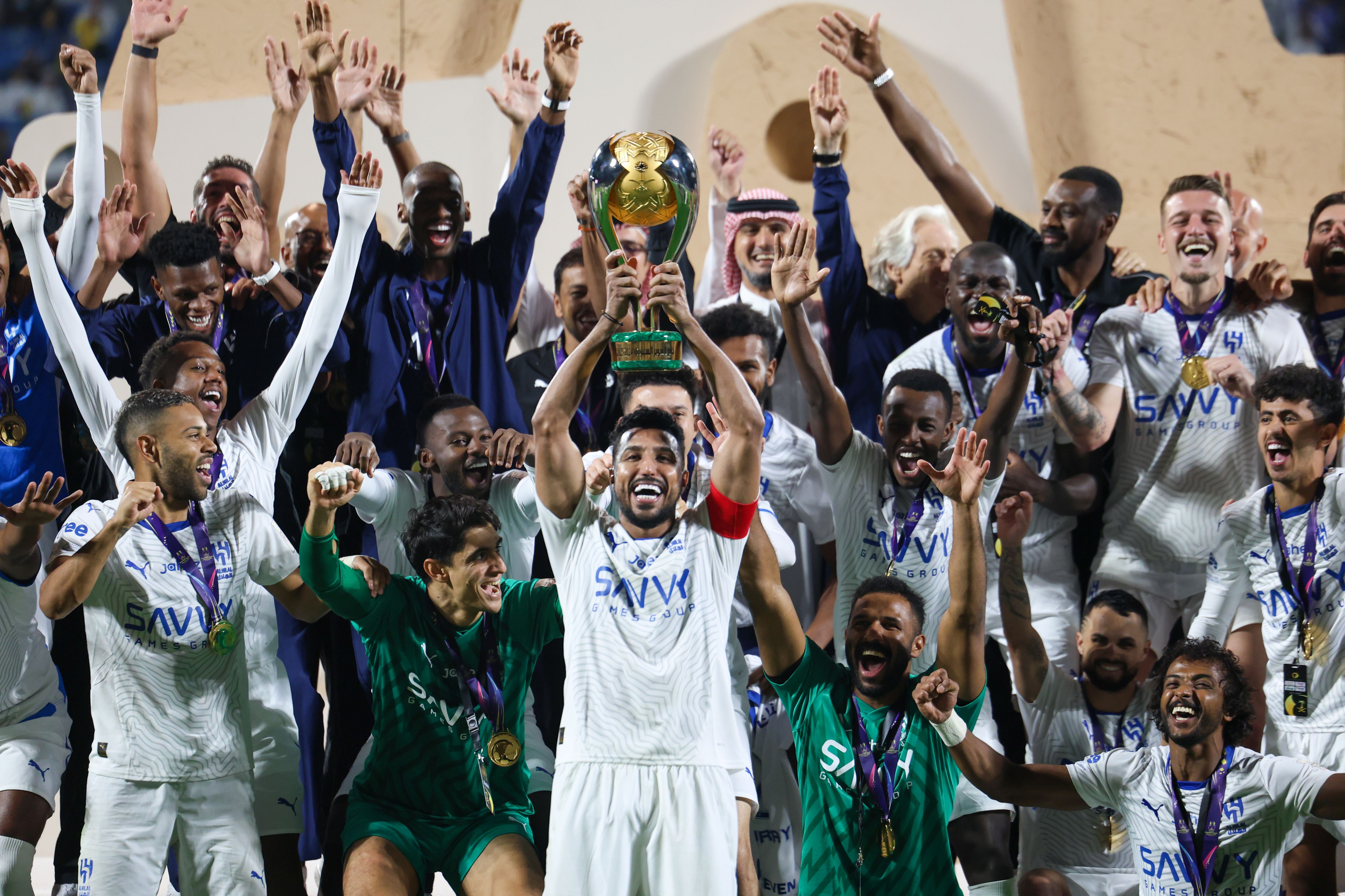 Salem Al Dawsari of Al Hilal lifts the trophy with the squad as he celebrates the victory and winning the Saudi Super Cup Final match between Al Nassr and Al Hilal at Prince Sultan bin Abdul Aziz Stadium on August 17, 2024 in Abha, Saudi Arabia. (Photo by Yasser Bakhsh/Getty Images)