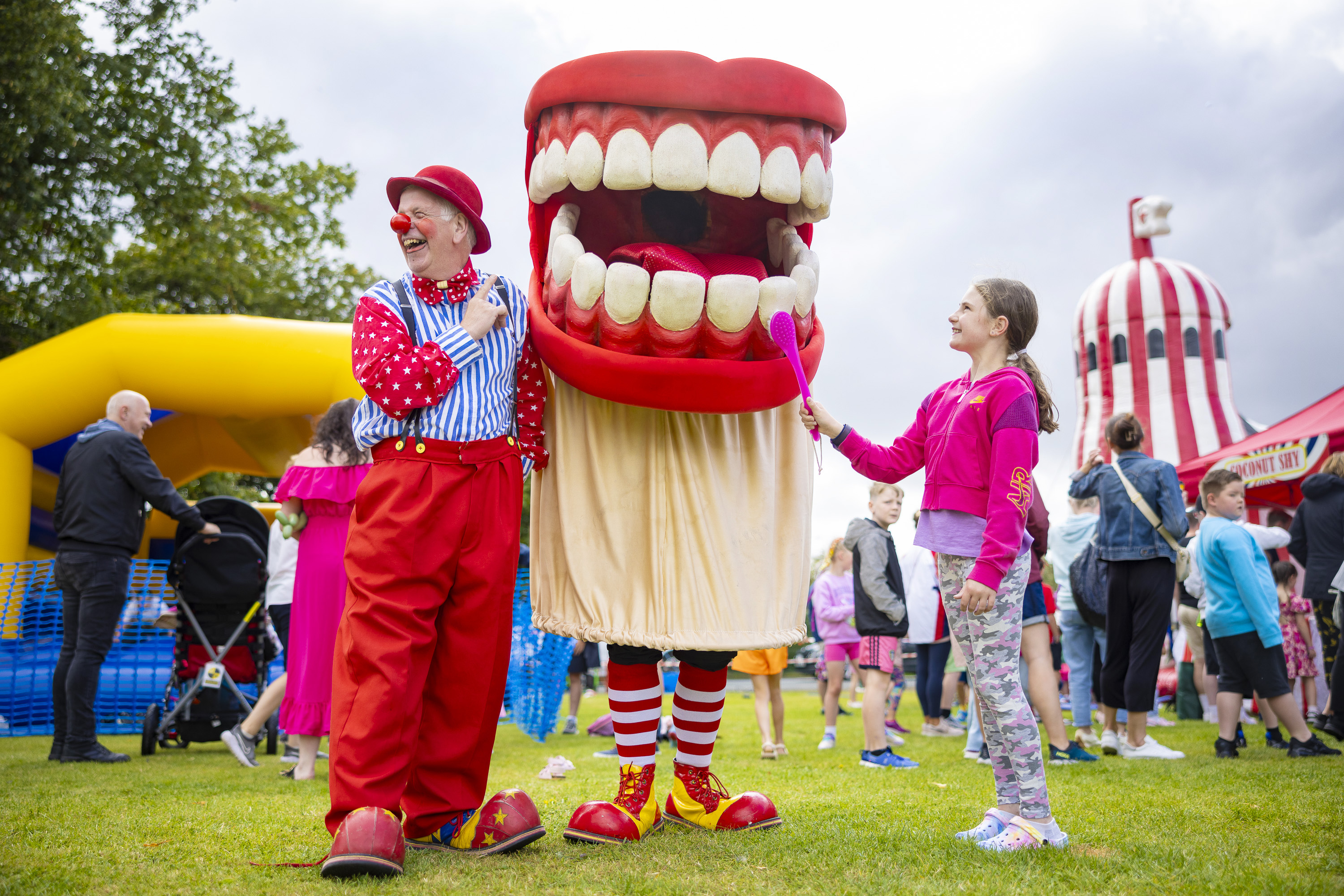 Nine-year-old Faith Sweeney helps brush some giant teeth as the National Festival Circus joins Thirsk Racecourse’s family fun day in North Yorkshire on August 8, 2024. (Photo by James Glossop/The Times)