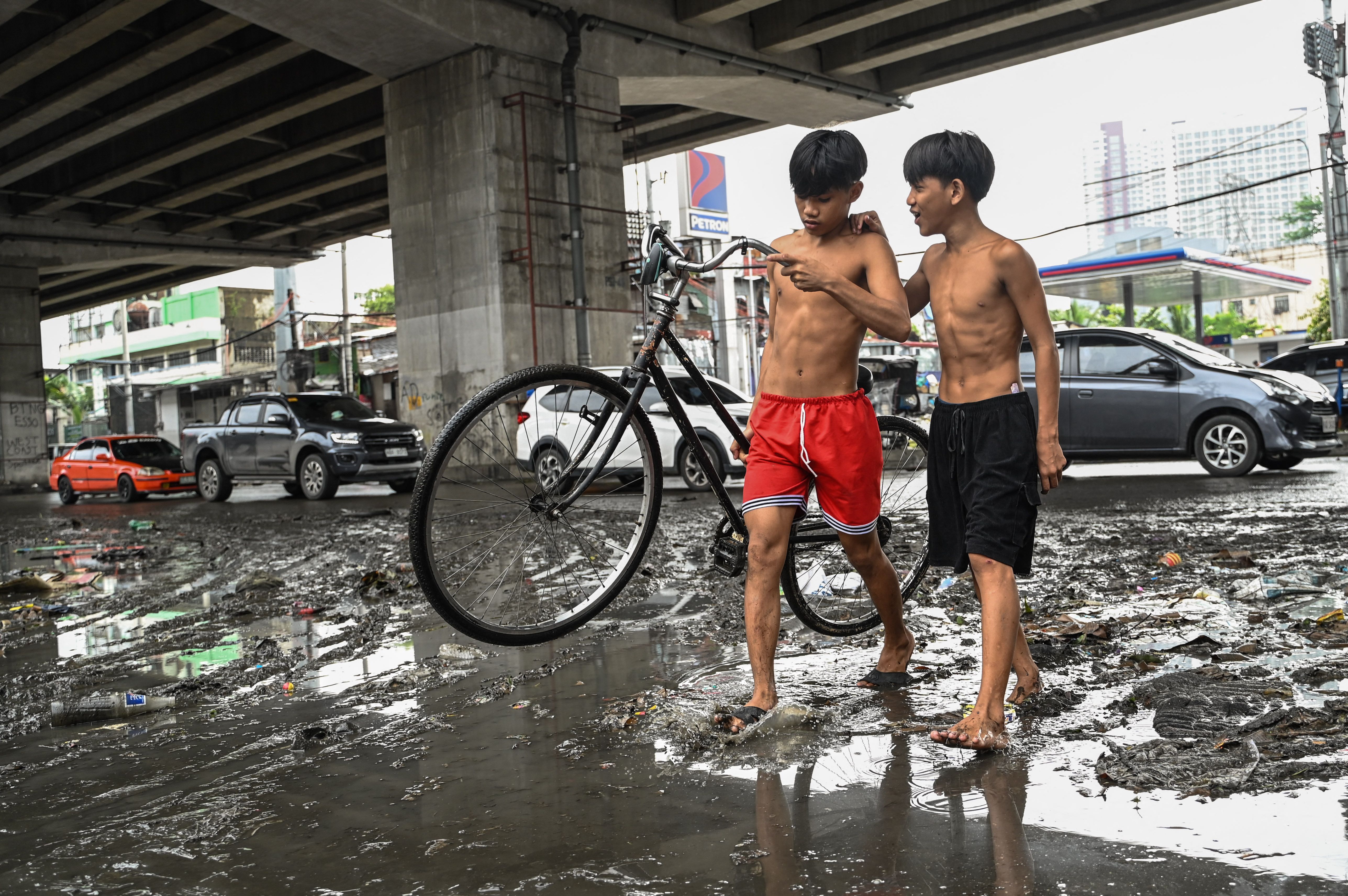 A boy carries his bicycle in the aftermath of Typhoon Gaemi in Manila on July 25, 2024. (Photo by Jam Sta Rosa/AFP Photo)