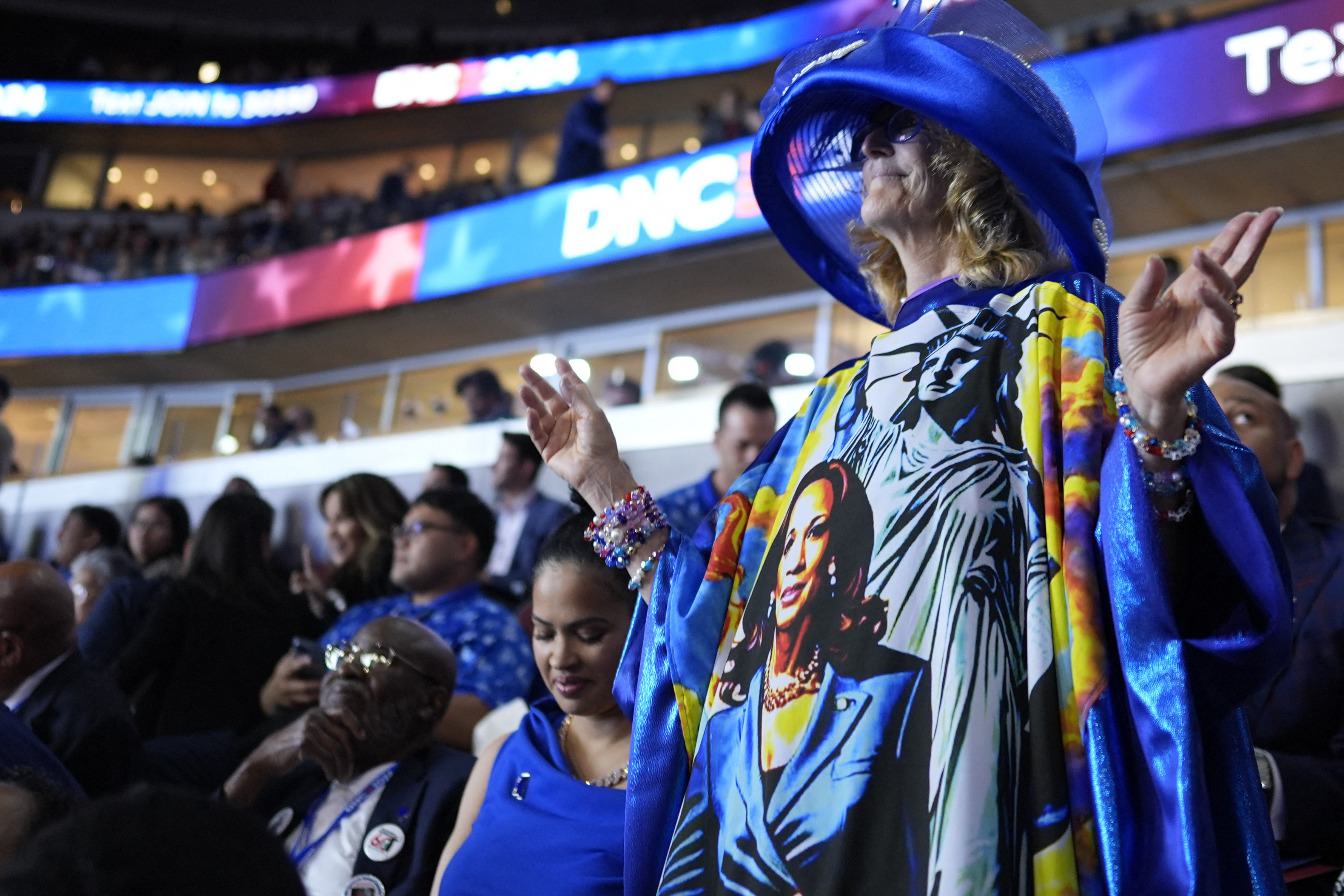 An attendee wears a dress with an image of Democratic presidential candidate and U.S. Vice President Kamala Harris on Day one of the Democratic National Convention (DNC) in Chicago, Illinois, U.S., August 19, 2024. (Photo by Cheney Orr/Reuters)