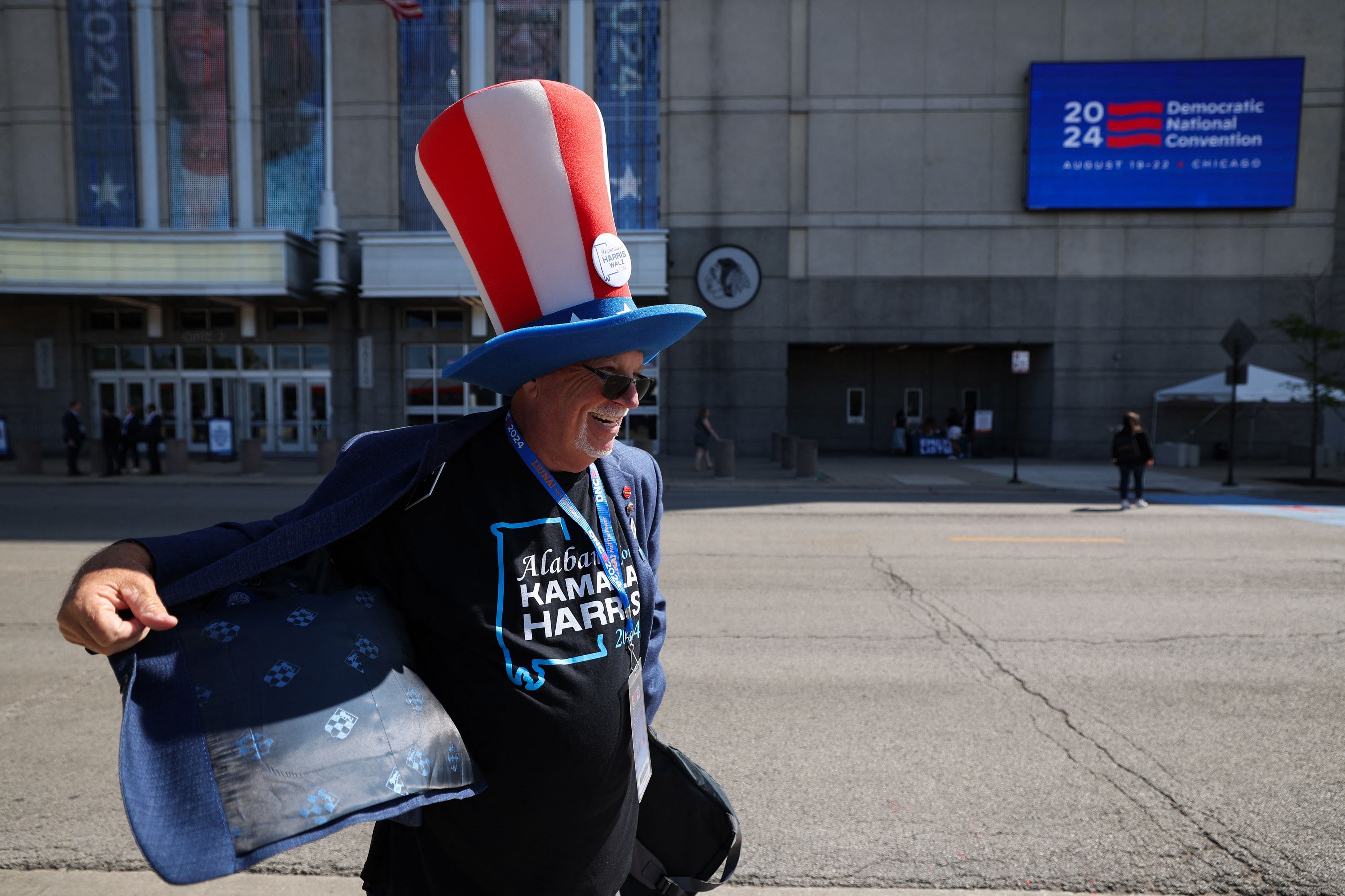 An attendee arrives for Day 2 of the Democratic National Convention (DNC) at the United Center, in Chicago, Illinois, U.S., August 20, 2024. (Photo by Kevin Wurm/Reuters)