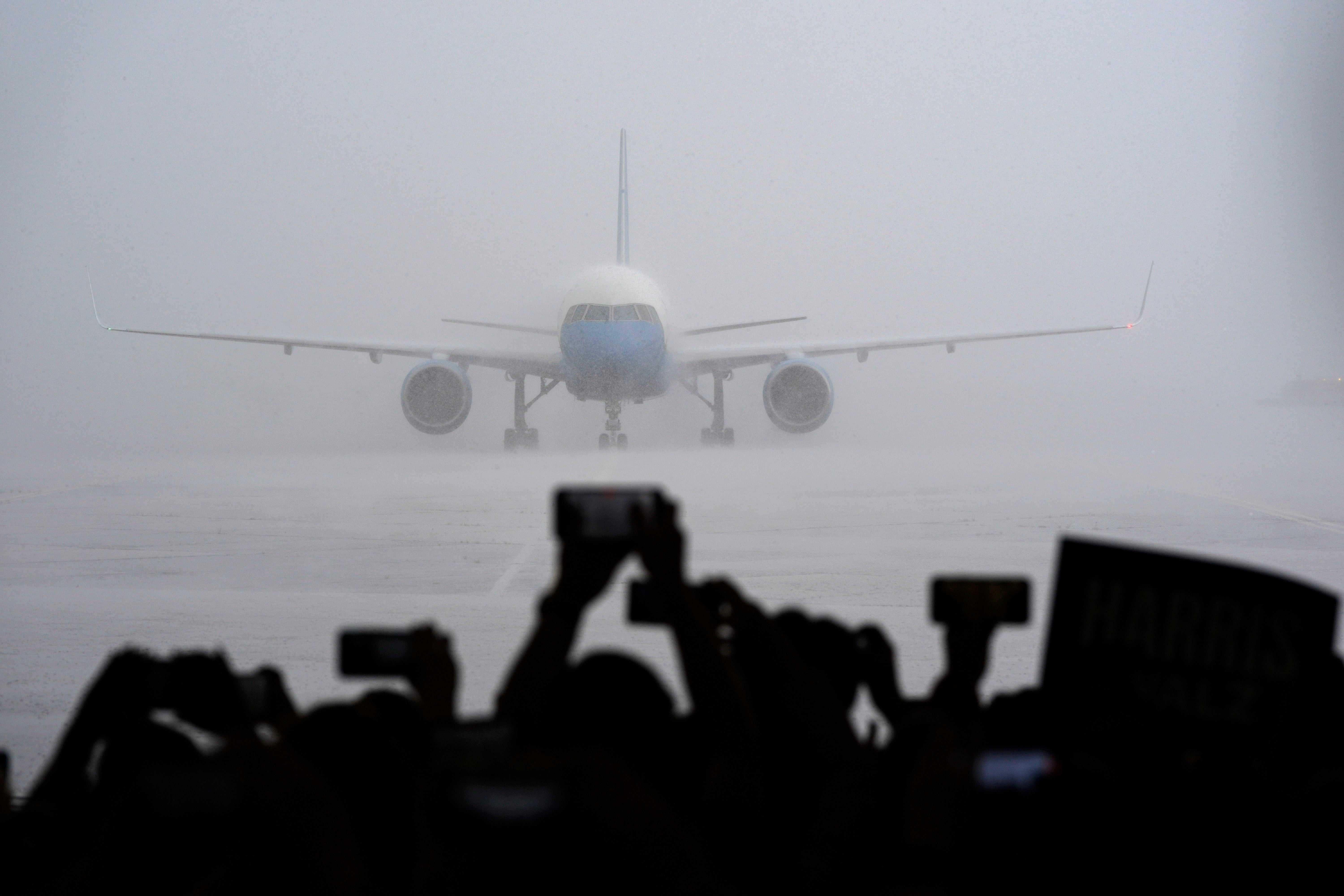 Supporters look on as Air Force Two with Democratic presidential nominee Vice President Kamala Harris on board lands at Pittsburgh International Airport, Sunday, August 18, 2024, in Pittsburgh. (Photo by Julia Nikhinson/AP Photo)