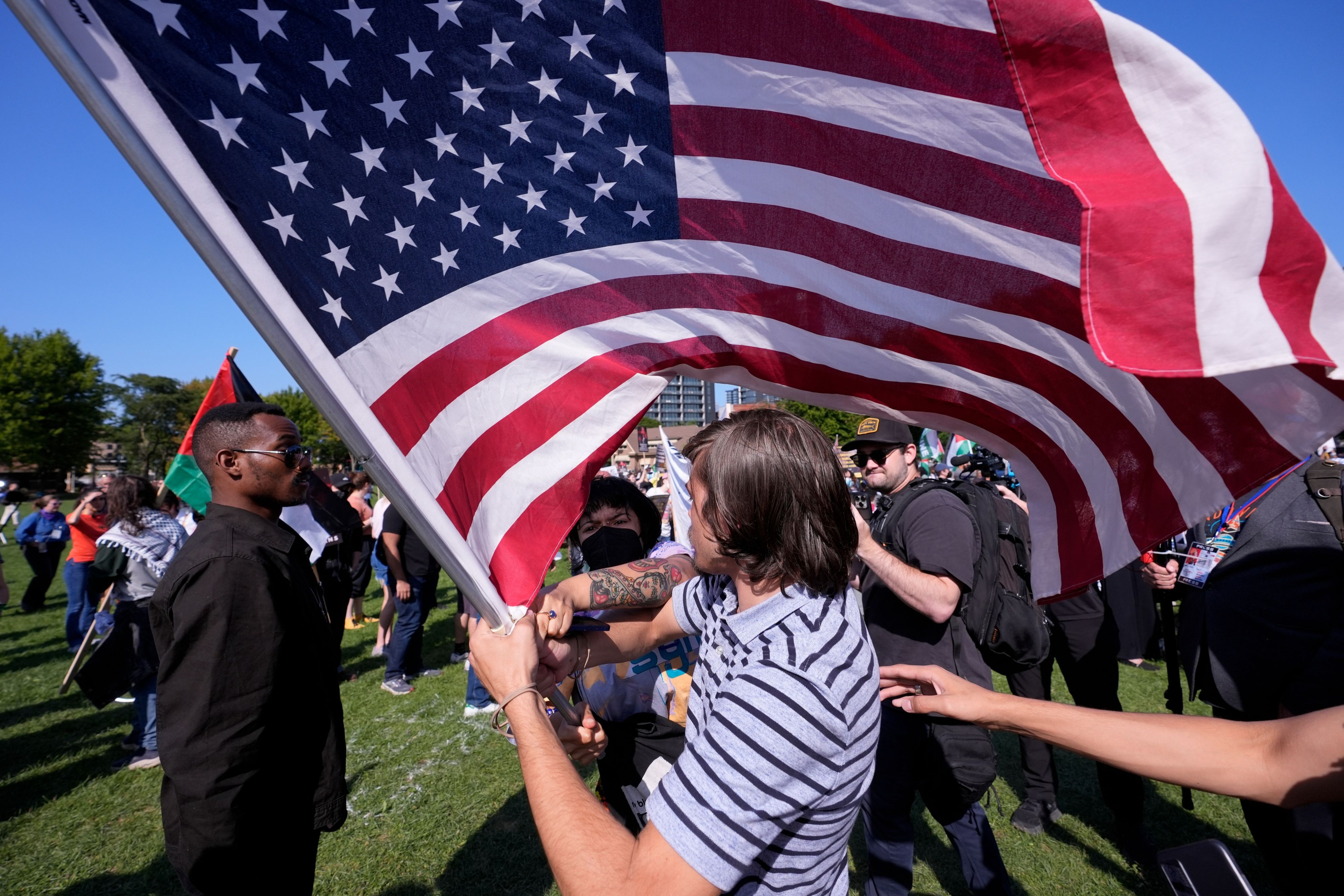 Demonstrators clash with counter protesters over the flag at a rally in Union Park during the Democratic National Convention Wednesday, August 21, 2024, in Chicago. (Photo by Alex Brandon/AP Photo)