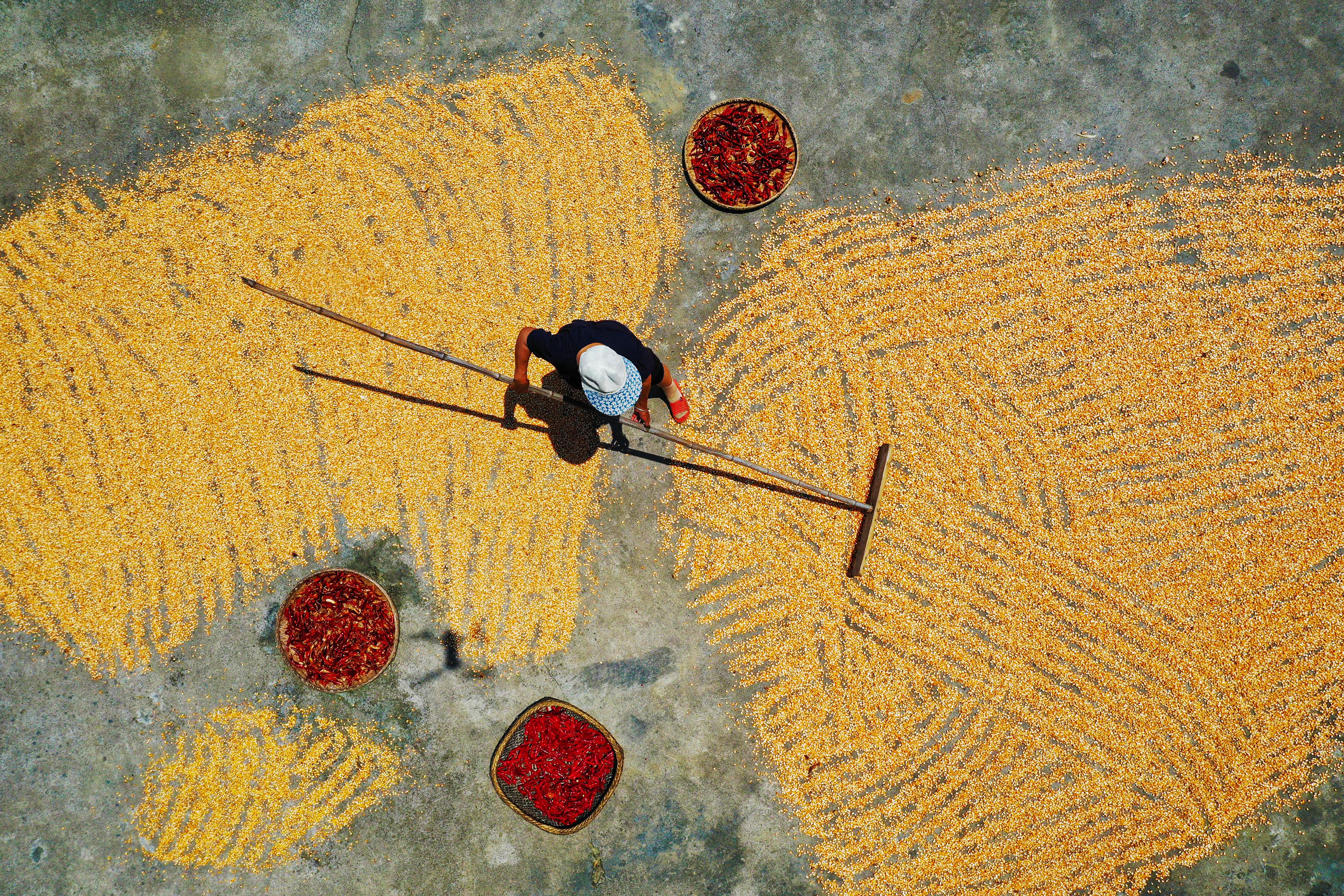 A farmer dries harvested corn and chilli peppers at a village in southwestern China's Chongqing municipality on August 7, 2024. (Photo by AFP Photo/China Stringer Network)