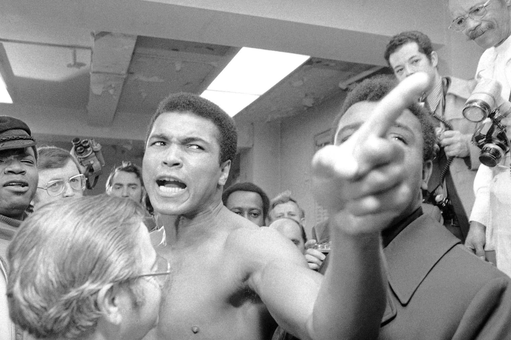 The boxer Muhammad Ali puts on a show at the New York State Athletic Commission's office in New York City on January 23, 1974, as he tries to force his way into the room where his opponent, Joe Frazier, was getting his pre-fight physical. (Photo by Marty Lederhandler/AP Photo)