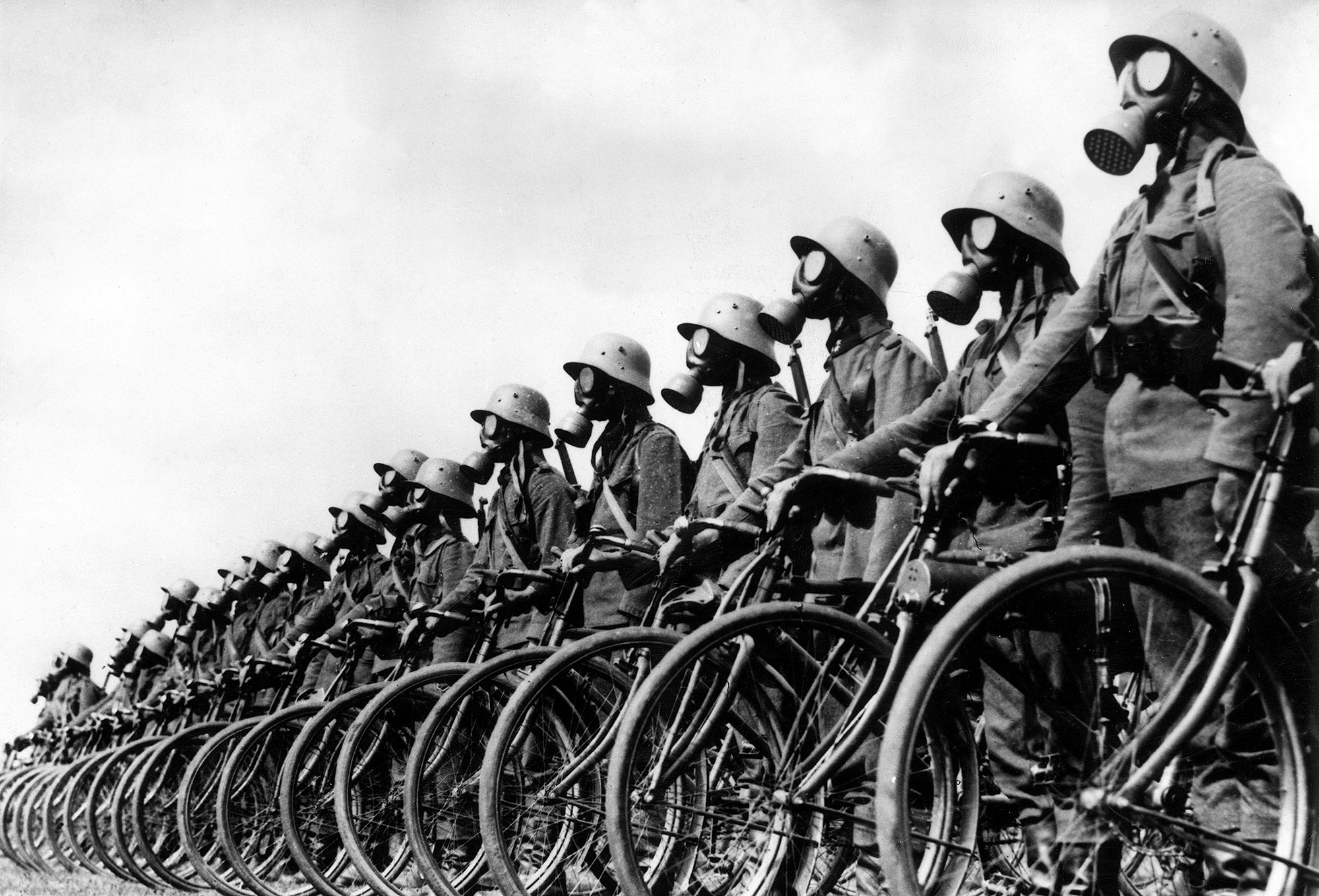 circa 1939: Full-length view of members of the German light machine-gun Cyclist Corps wearing gas masks while standing next to their bicycles in a lineup in Austria during World War II. A machine gun is attached to one of the bicycles (2nd from R). (Photo by Hulton Archive/Getty Images)