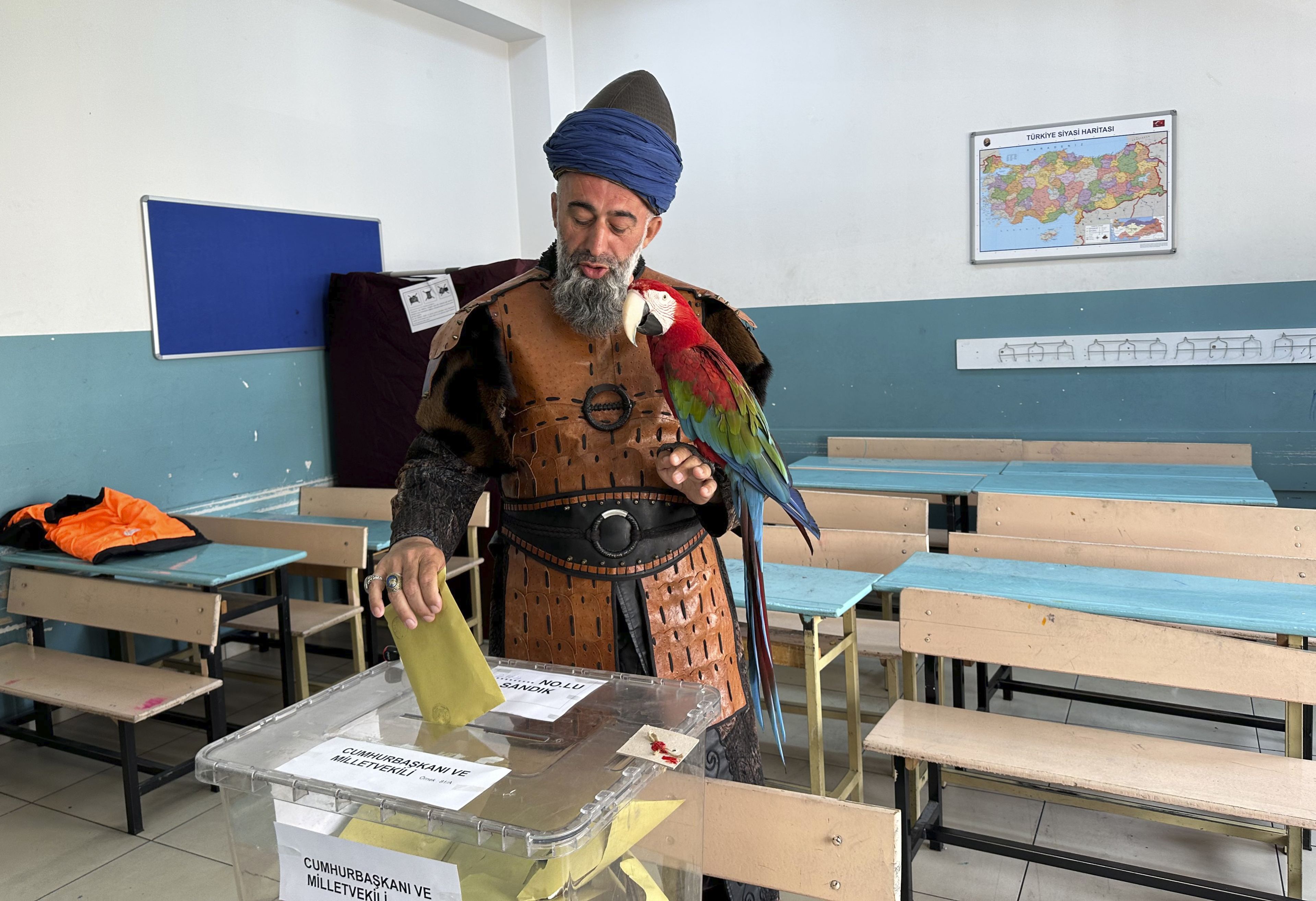 Nazim Cihan, 48, holds his bird as he votes at a polling station in Istanbul, Turkey, Sunday, May 14, 2023. Voters in Turkey go to the polls on Sunday for pivotal parliamentary and presidential elections that are expected to be tightly contested and could be the biggest challenge Turkish President Recep Tayyip Erdogan faces in his two decades in power. (Photo by iHA via AP Photo)